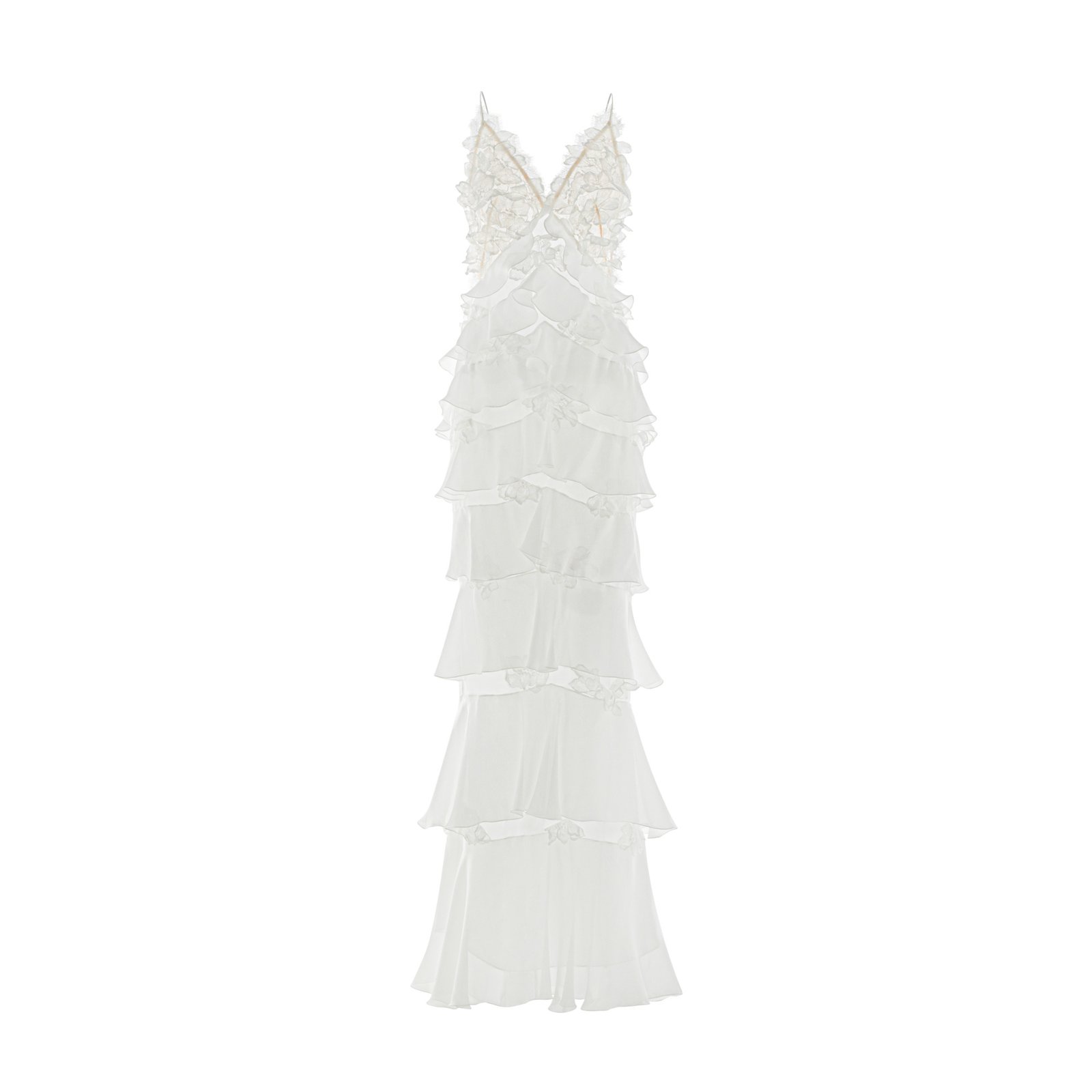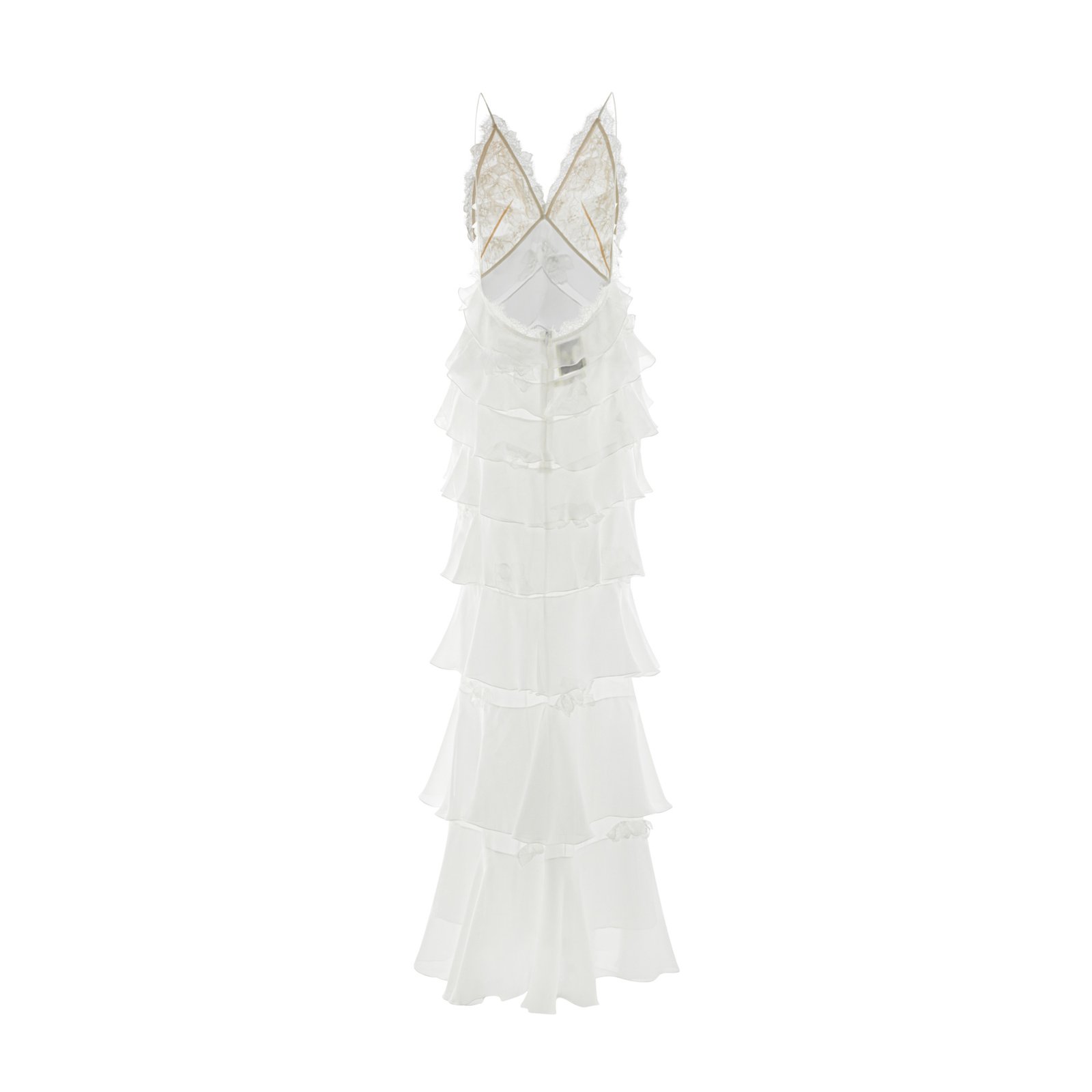 Alejandra is a waltz of sunlight and breeze, woven from cascading ruffles and delicate 3D lace blooms. The dress sketches a soft, flowing curve through the air, with a bare back shimmering under the golden dusk. A design that breathes both classic romance and free-spirited charm, where the timeless beauty of old Italy is awakened with every graceful step.