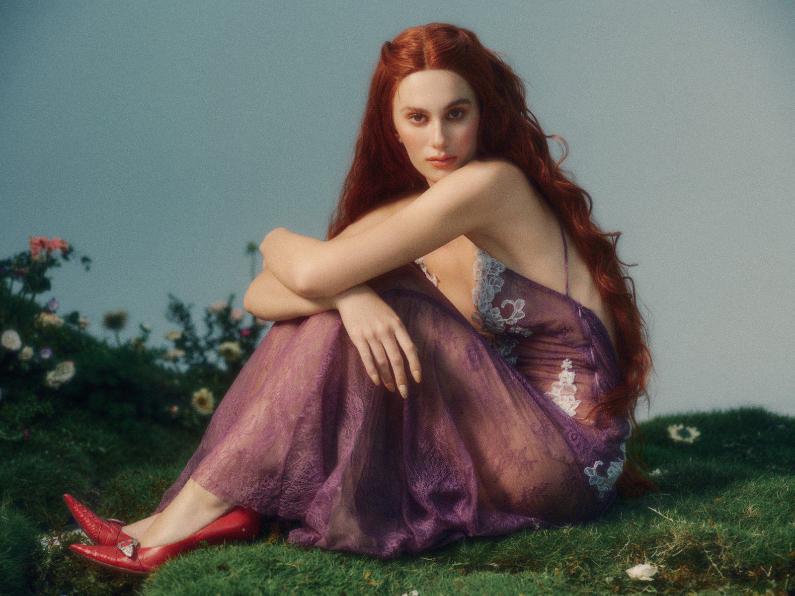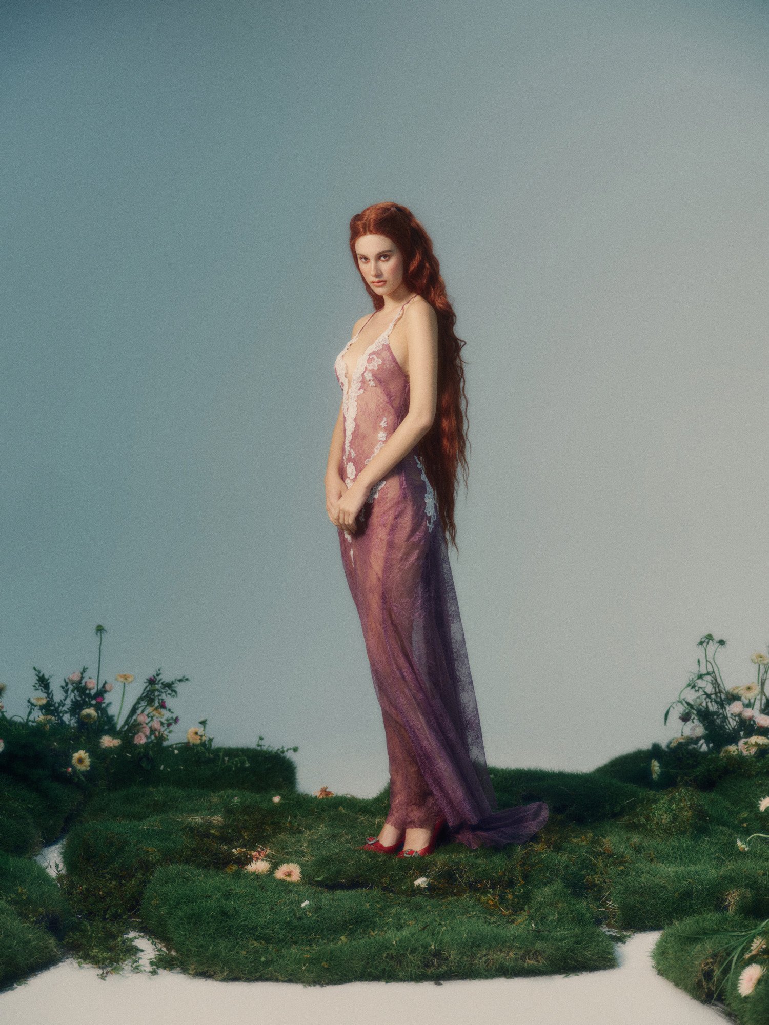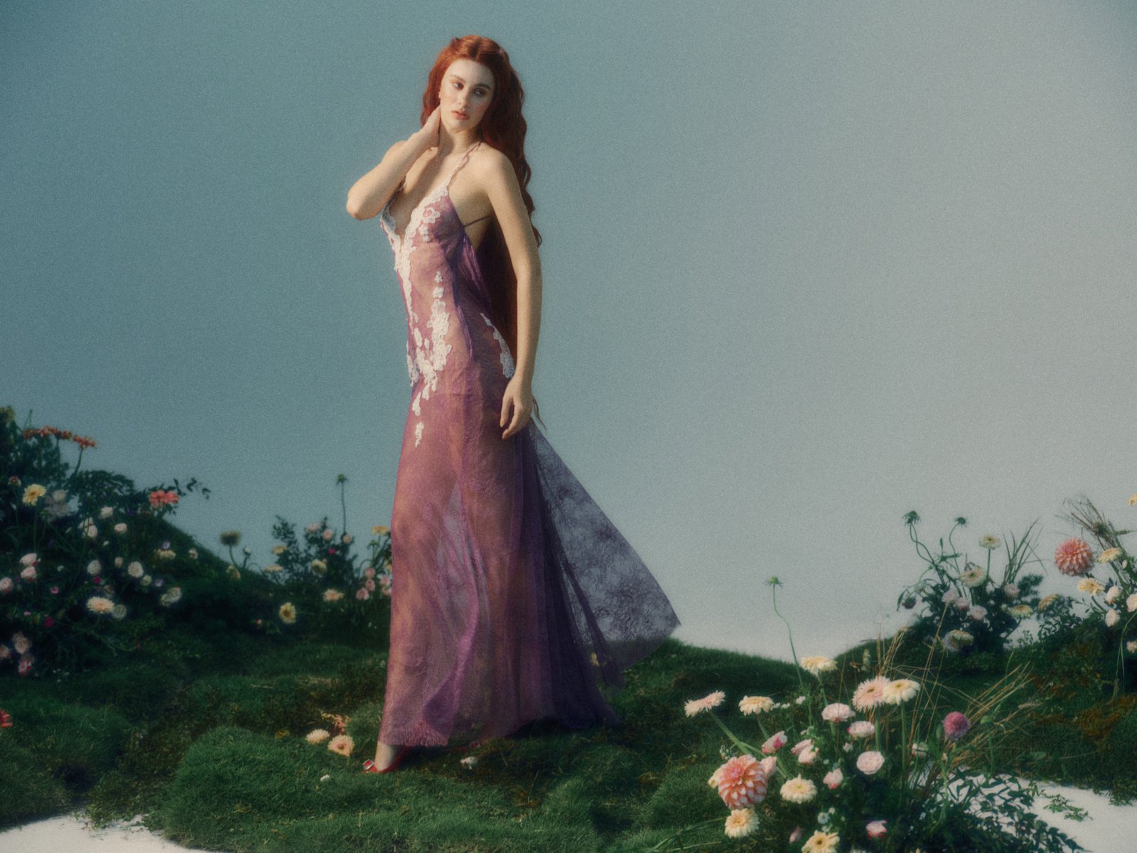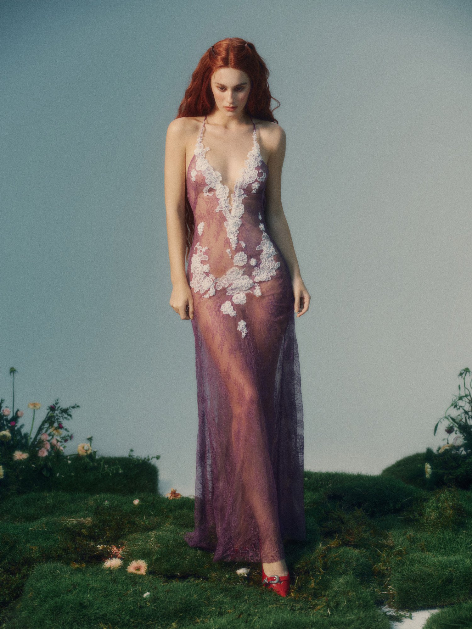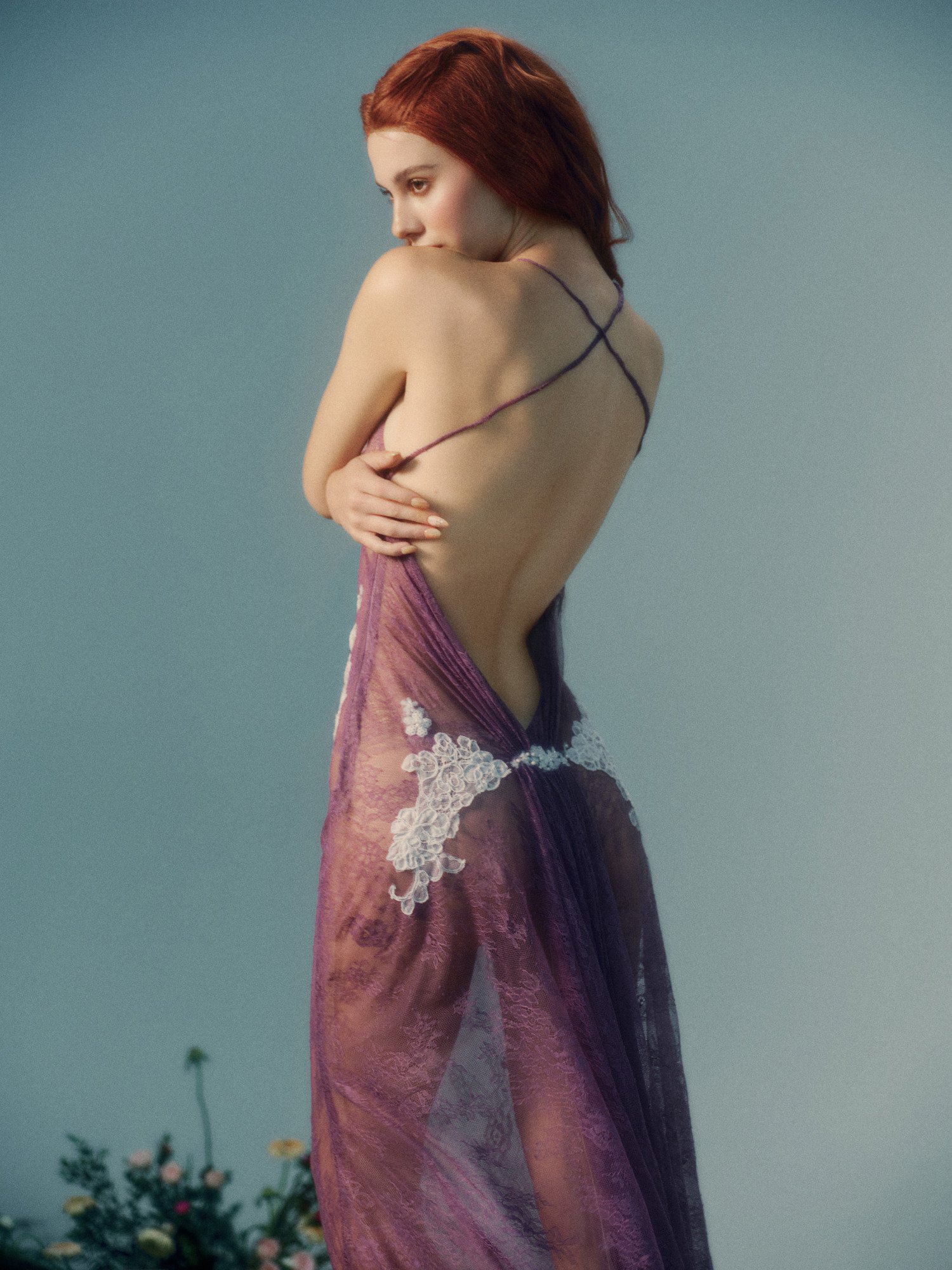 Beneath the dress, Antheia is quietly honored as the goddess of flowers, an embodiment of growth and the gentle beauty of spring. Like a bloom on the verge of opening, she reveals herself through delicate layers of lilac lace, where white floral appliqués softly unfold across the body. The effect is pure and weightless, a kind of untouched innocence—like a soul that has never known a single mark.