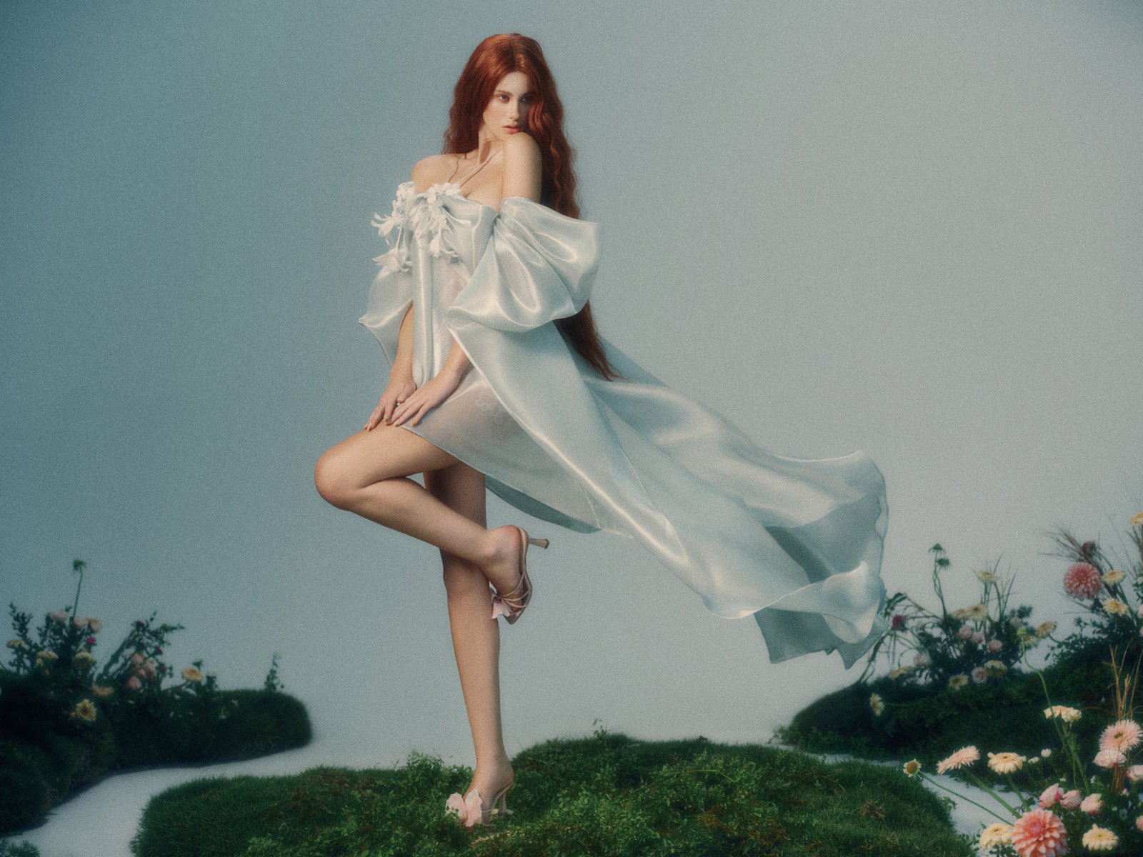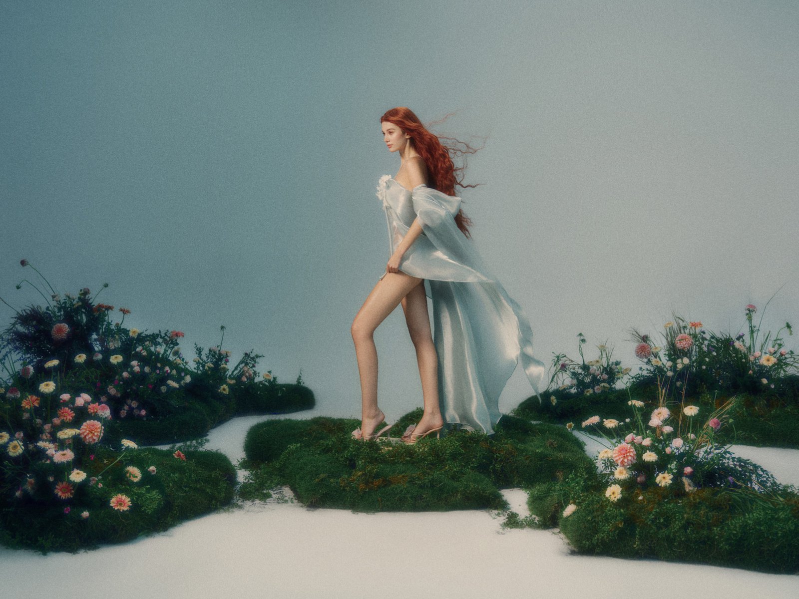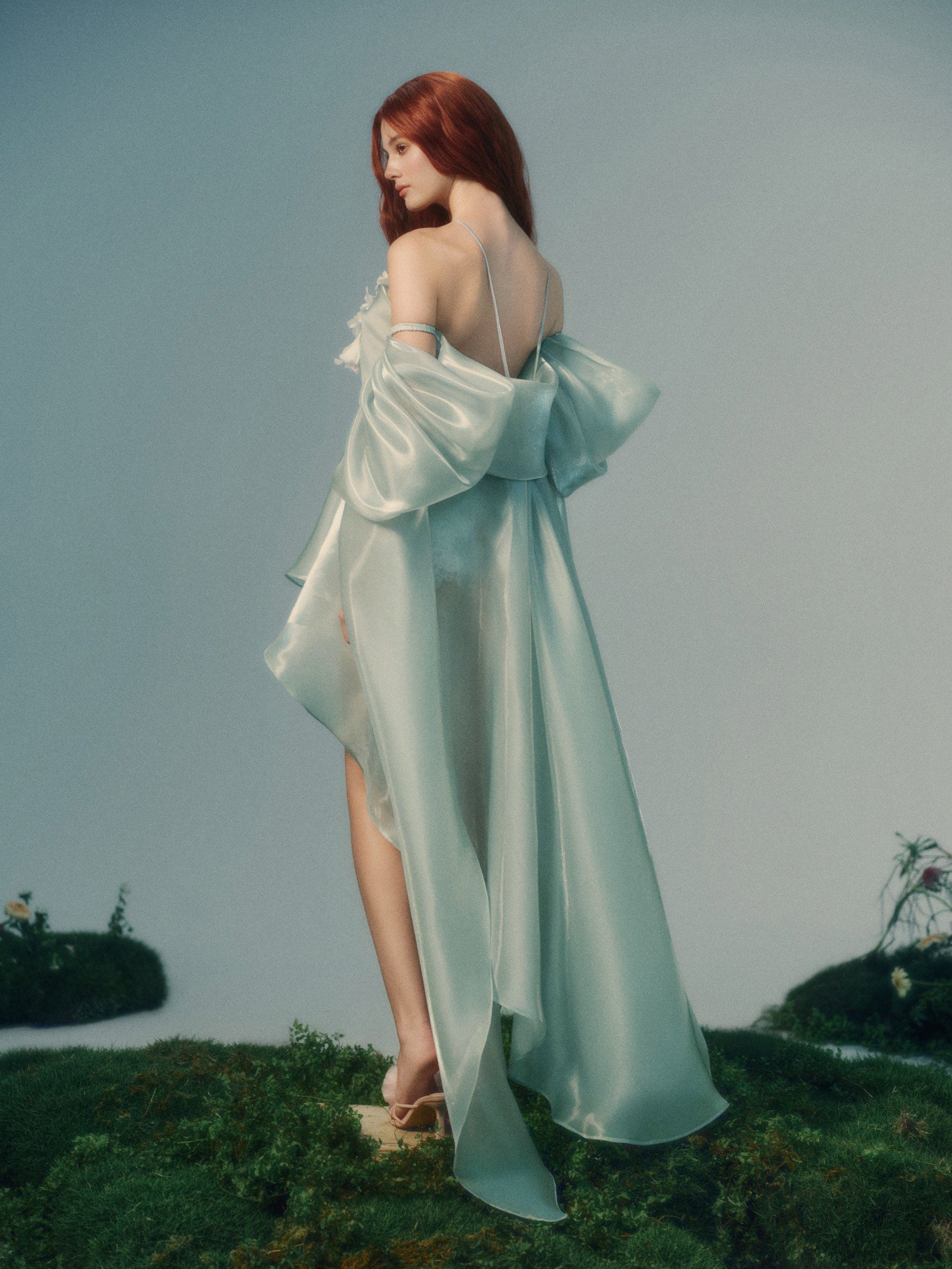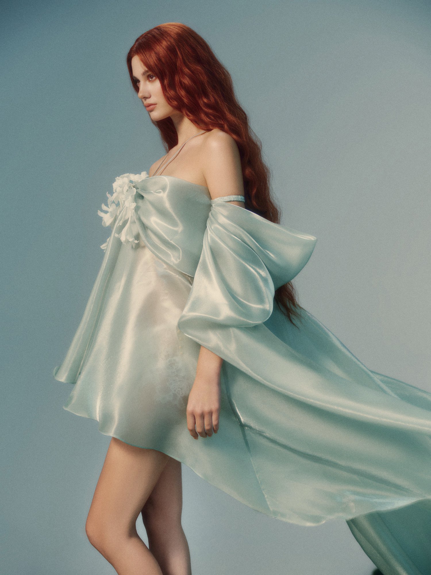 The airy silhouette captures the first moment the wind meets the body. Liquid organza flows with each step, while a flower at the bodice marks the beginning of a subtle transformation.