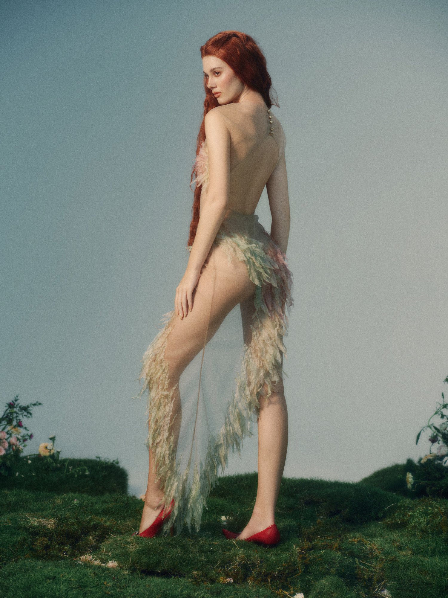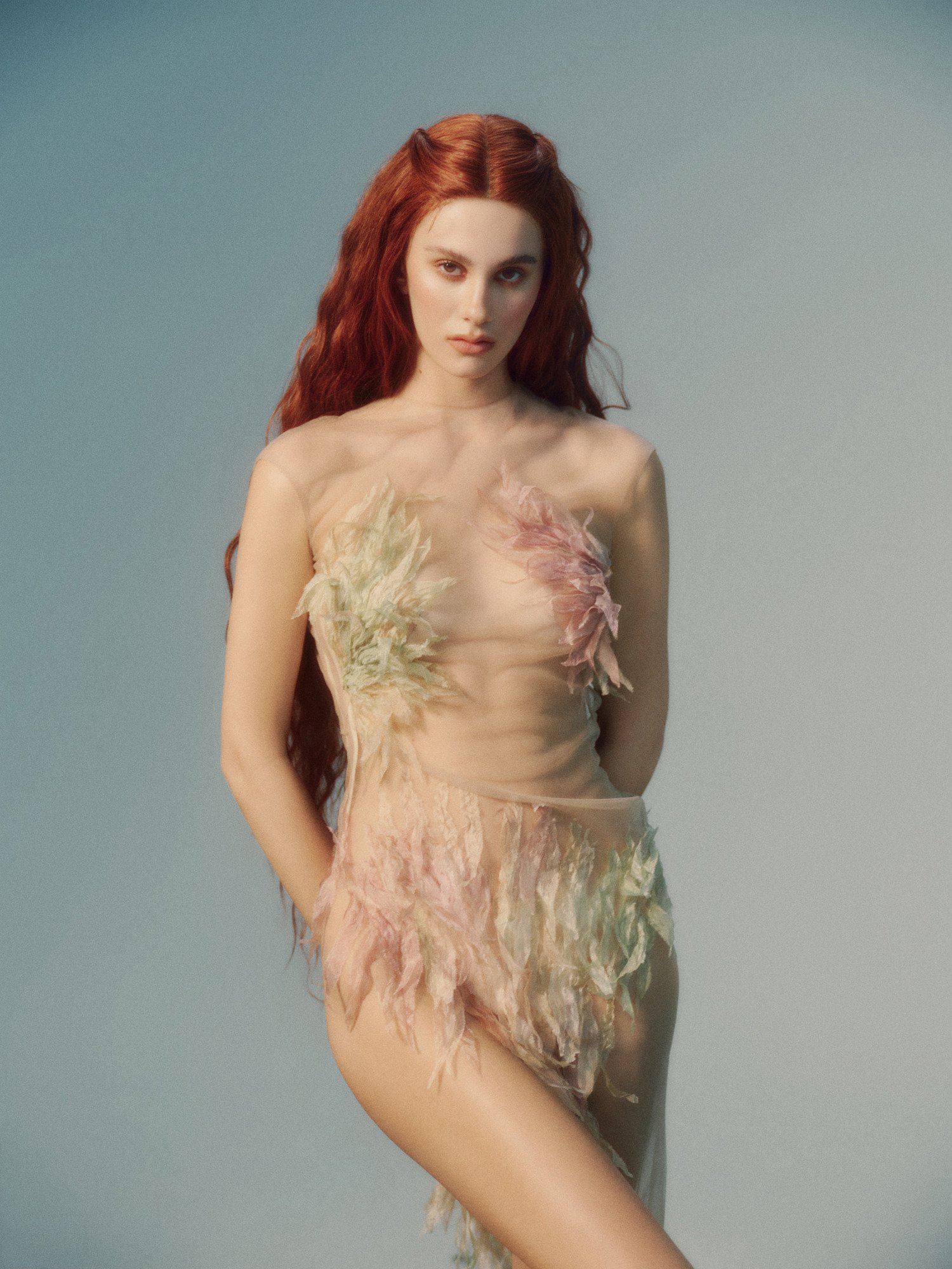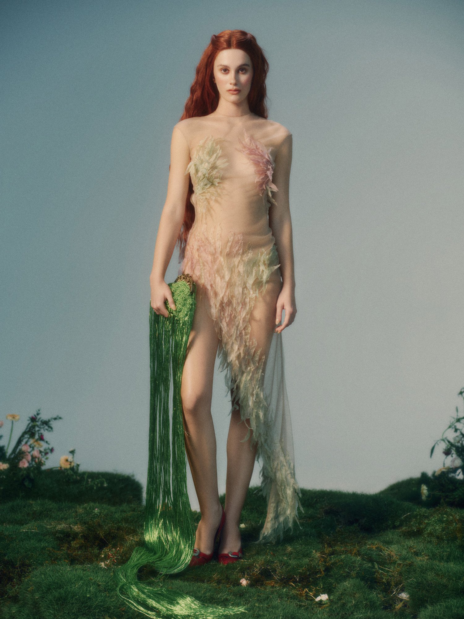 Emerging from the heart of ancient woods, Dryad represents a profound symbiosis between humanity and nature. This ethereal silhouette, crafted from whisper-light sheer fabric, is adorned with silken leaves that seem to grow directly from the skin. Paired with a cascading moss-green fringe bag, she stands as a living testament to spring’s rebirth – a forest spirit captured in a moment of fleeting, breathtaking grace.
