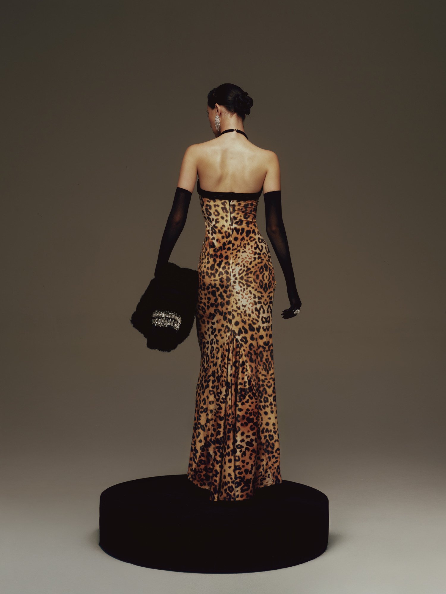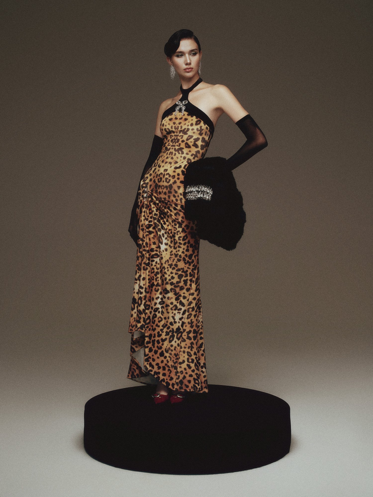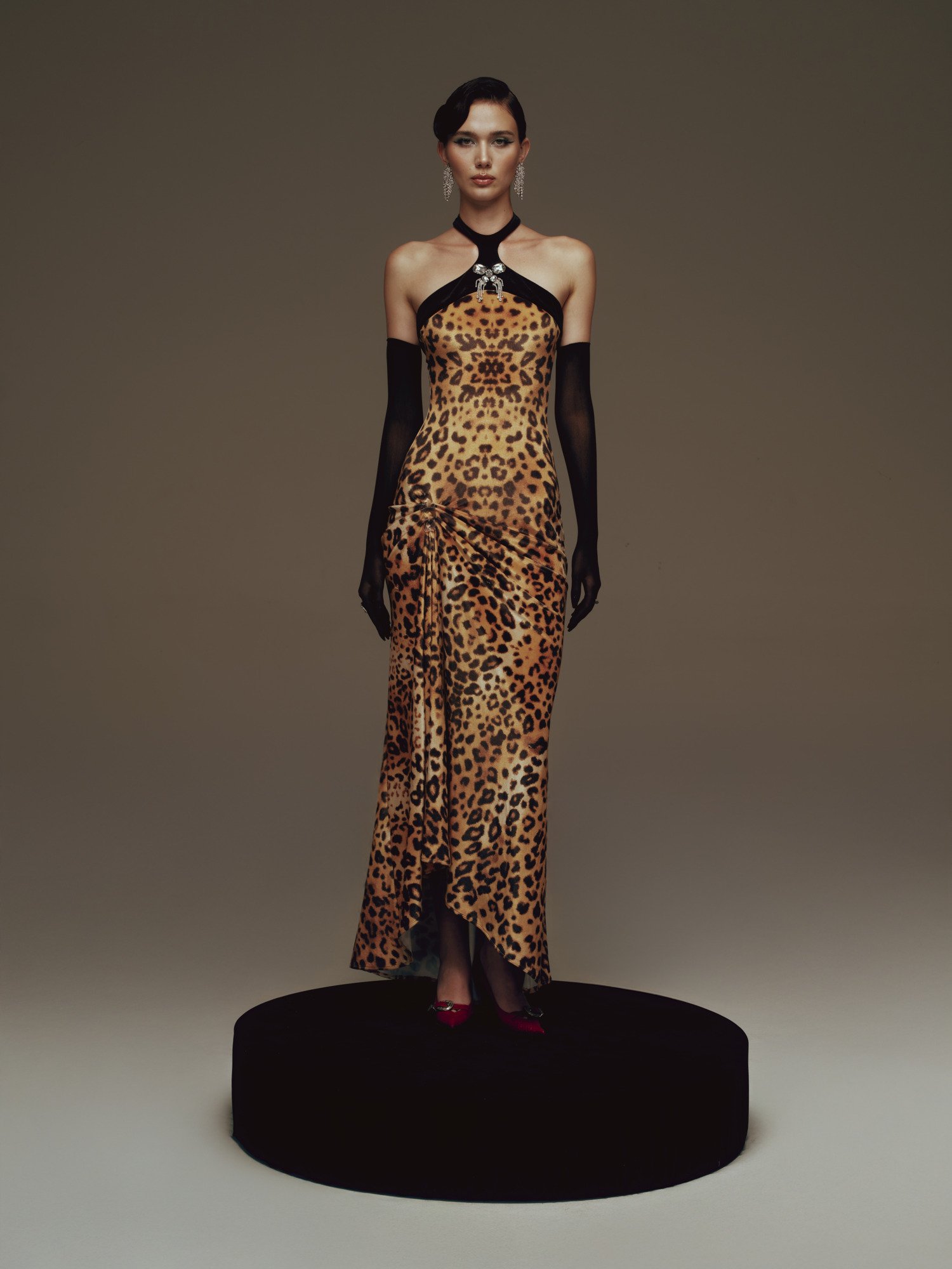 A long, body-hugging dress set against a leopard-print backdrop, with a close-fitting silhouette that fully accentuates the curves. The black halter neckline leaves the shoulders bare, highlighted by a jewel-like embellishment at the center, while asymmetric draping at the hip creates soft gathers and a natural slit. The result is a look that feels both sharp and alluring, imbued with the timeless glamour of Old Hollywood.