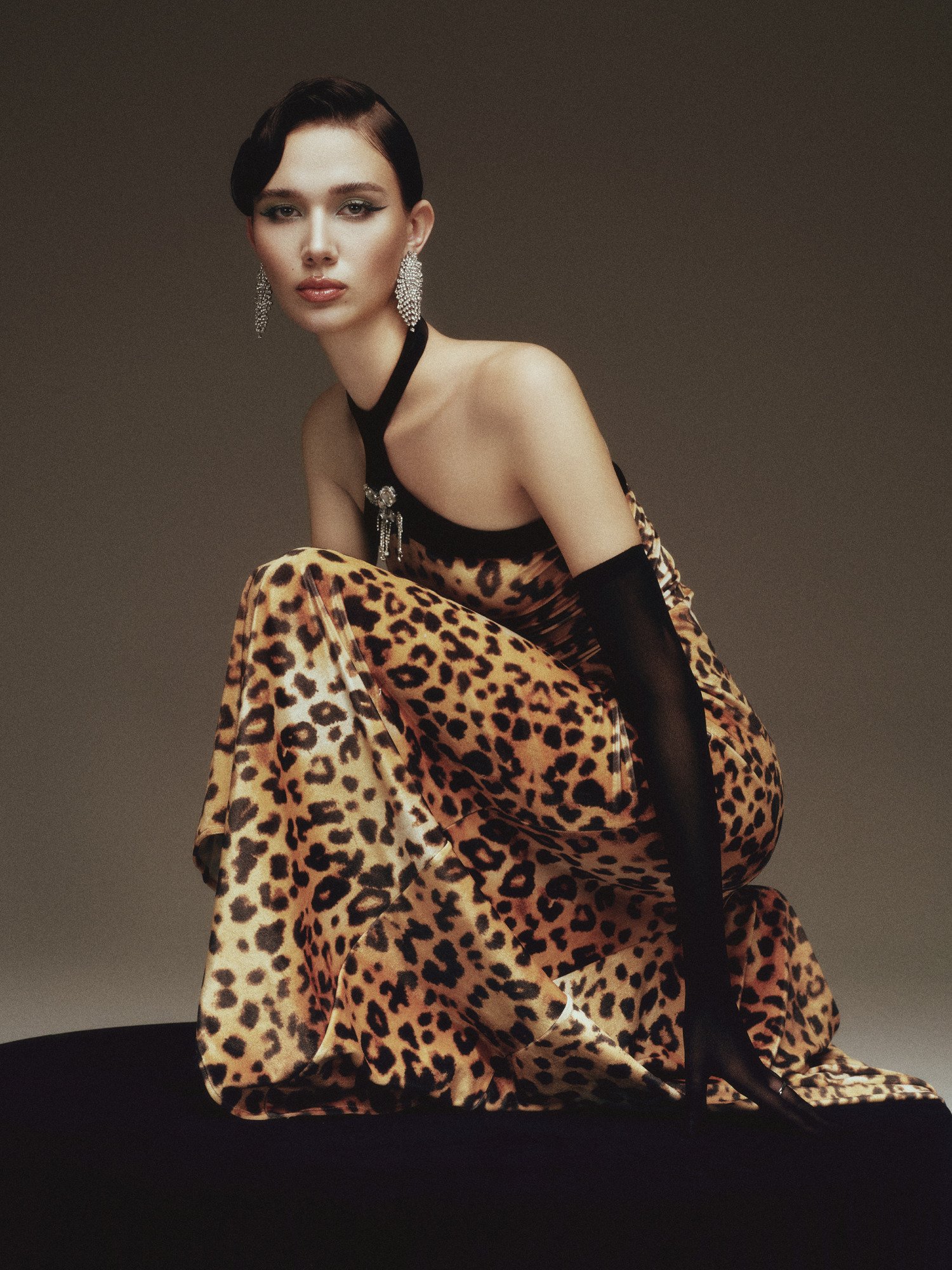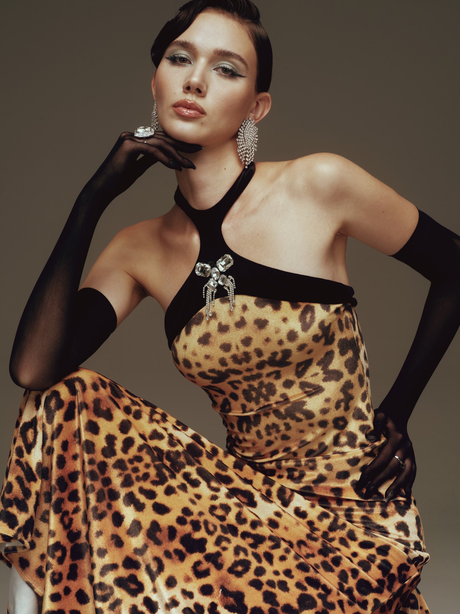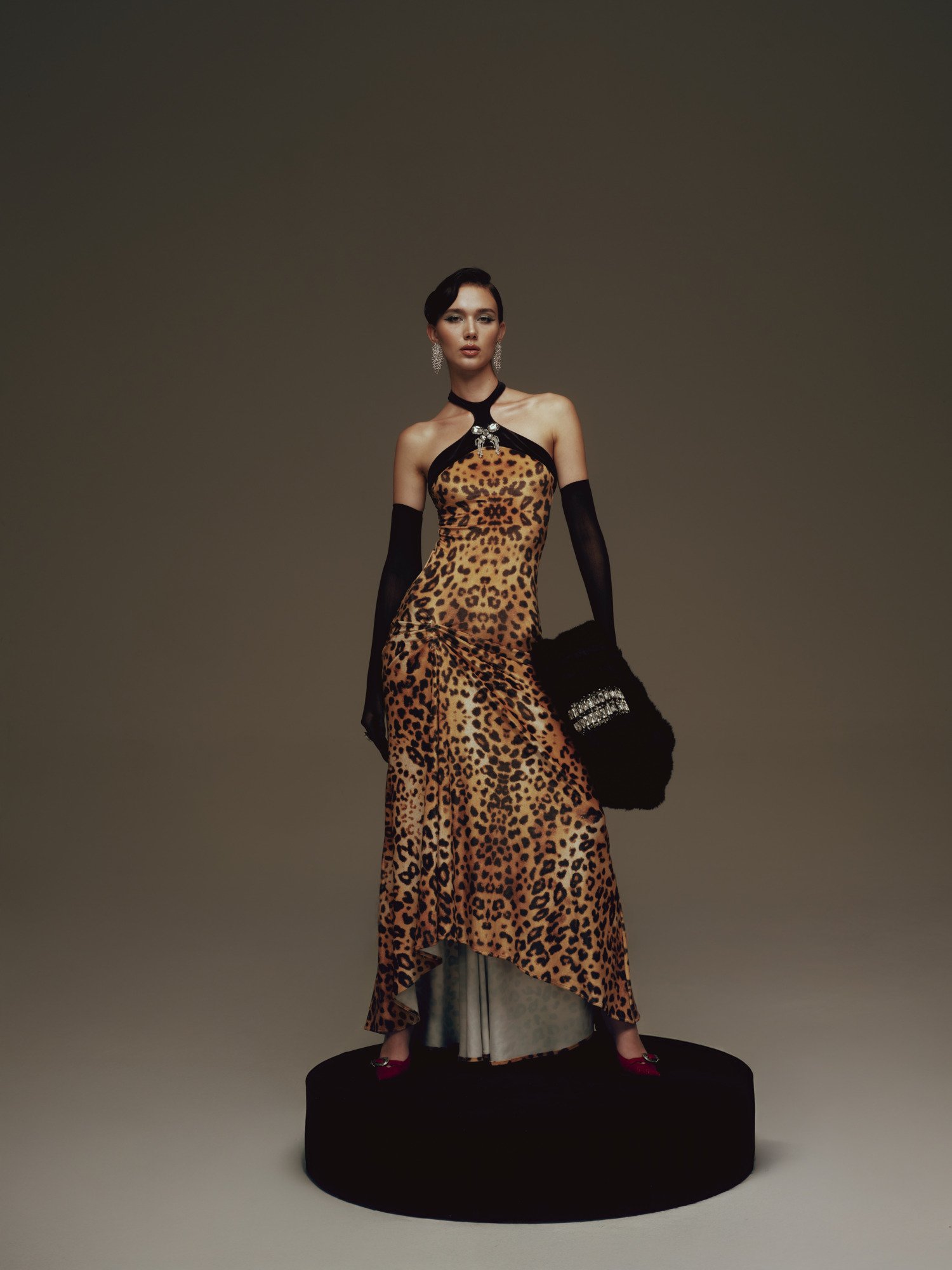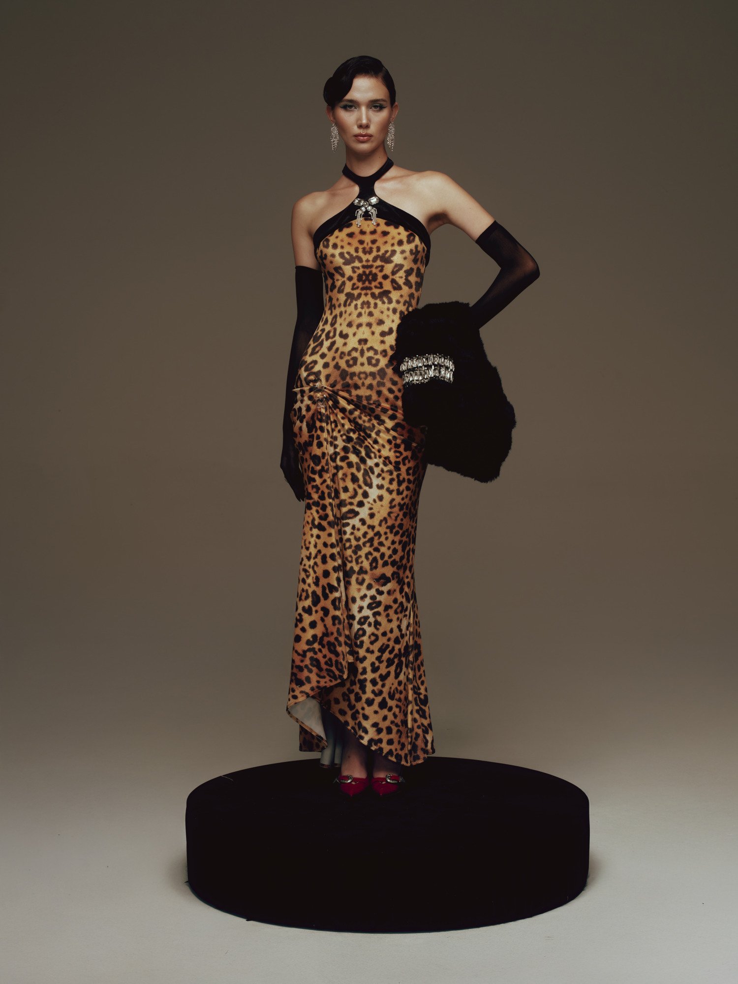 A long, body-hugging dress set against a leopard-print backdrop, with a close-fitting silhouette that fully accentuates the curves. The black halter neckline leaves the shoulders bare, highlighted by a jewel-like embellishment at the center, while asymmetric draping at the hip creates soft gathers and a natural slit. The result is a look that feels both sharp and alluring, imbued with the timeless glamour of Old Hollywood.