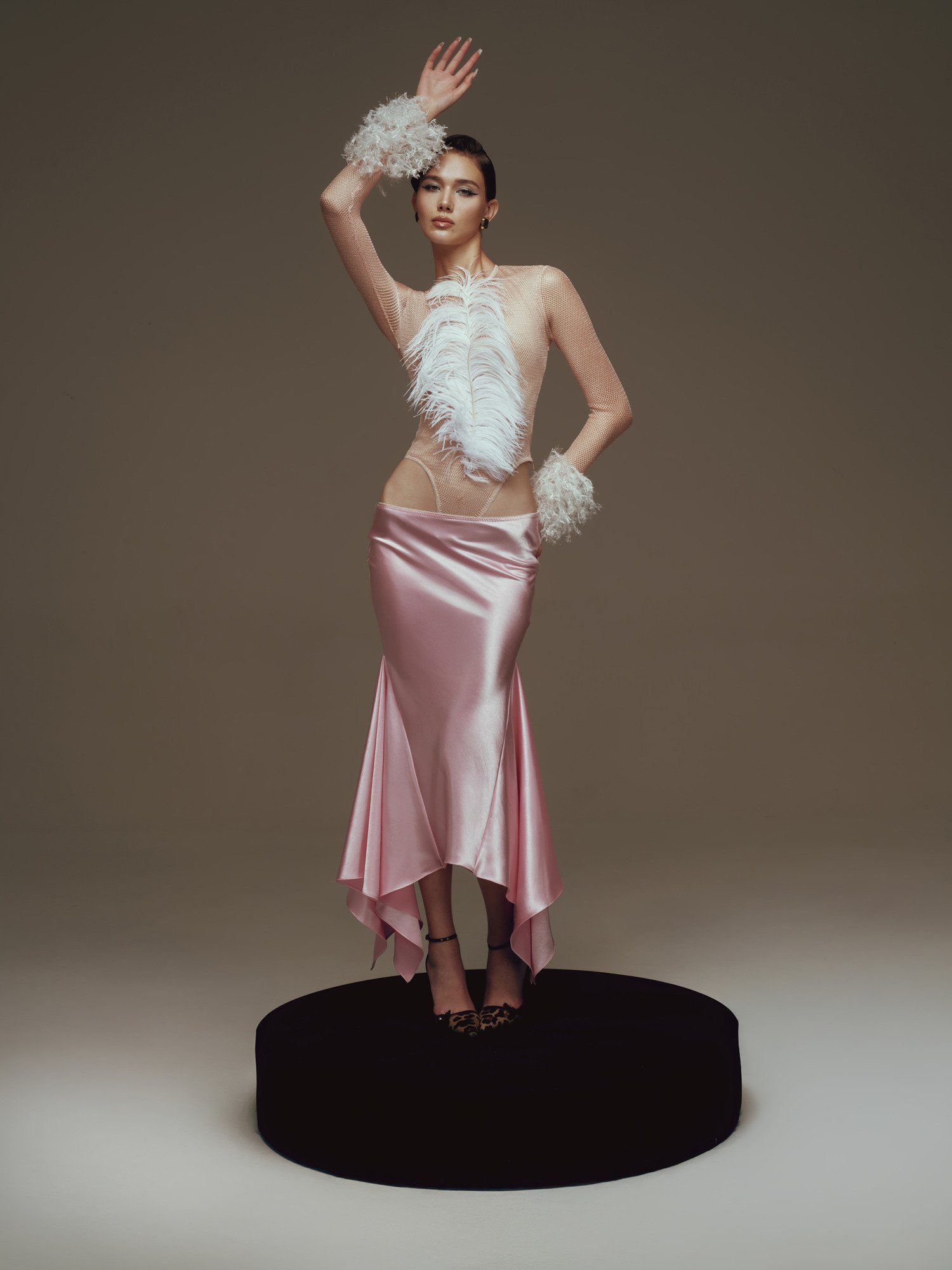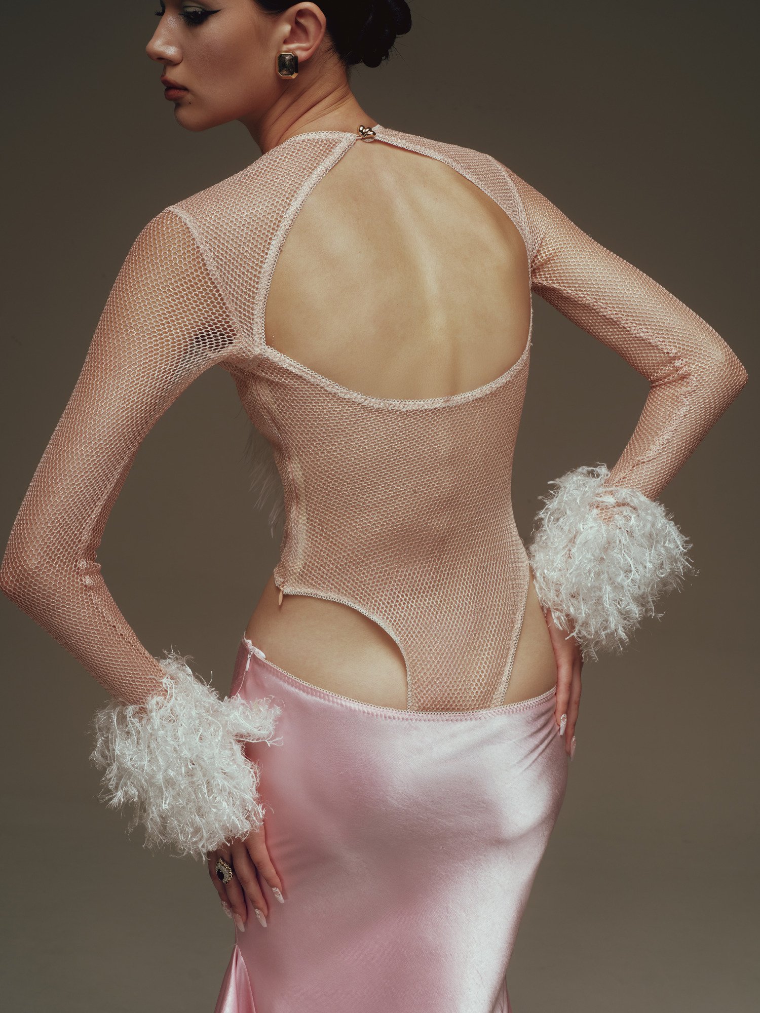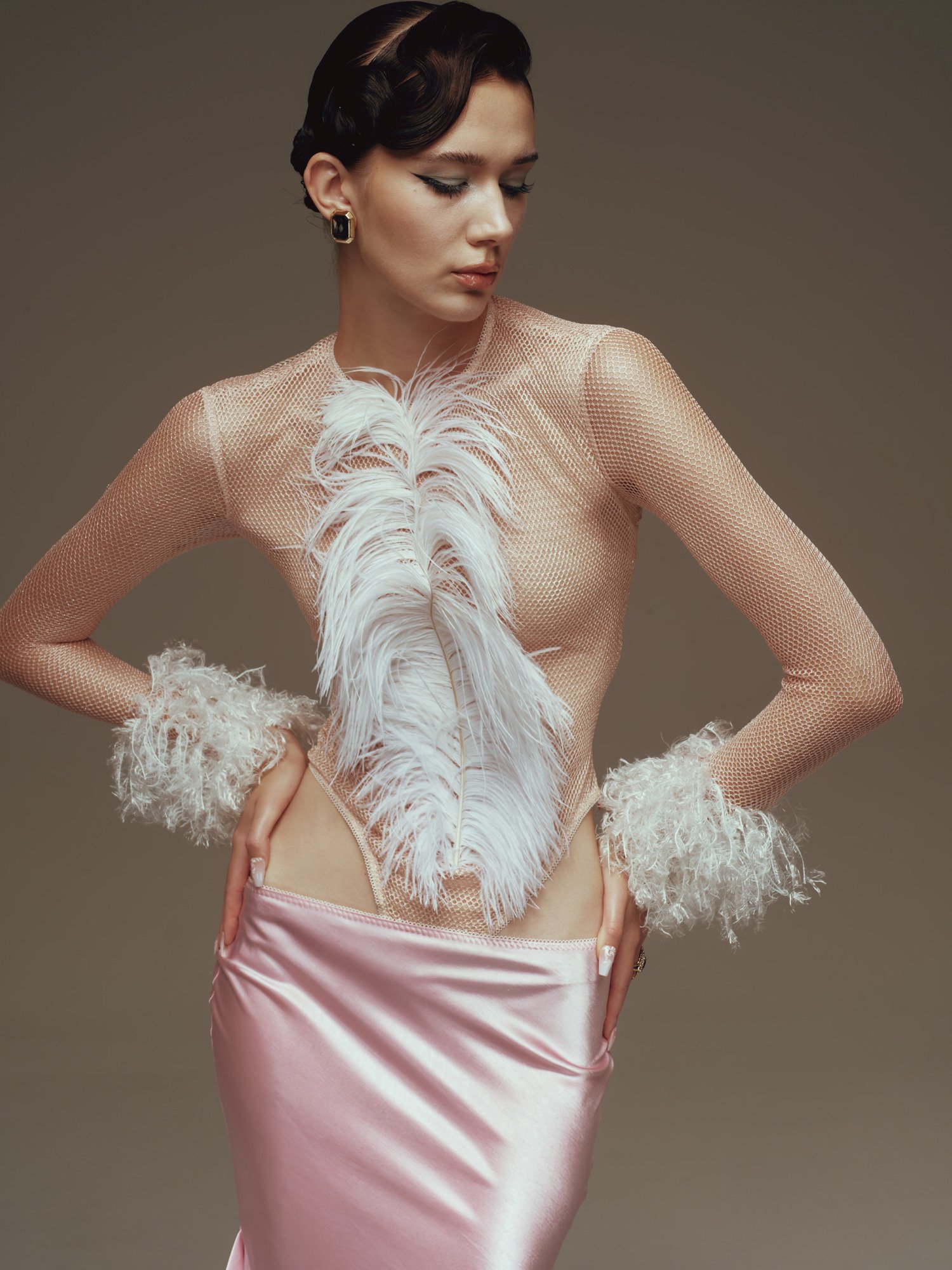A form-fitting bodysuit crafted from fine, sheer mesh that contours the body like a second skin. The design features a wide open back with delicate, refined edging, complemented by hand-applied ostrich feather details along the front and at the wrists, creating an accent that feels both fragile and sensually refined.