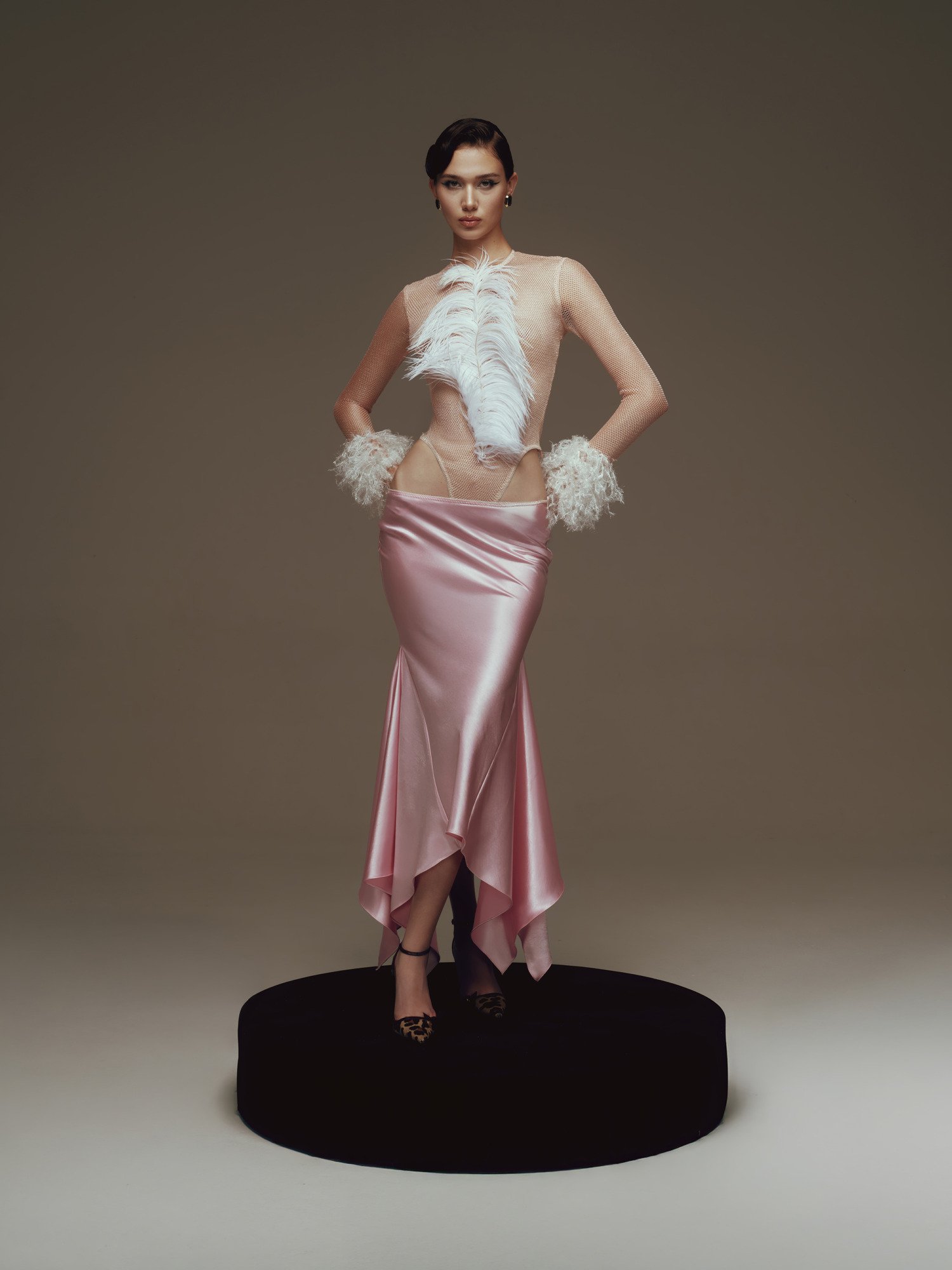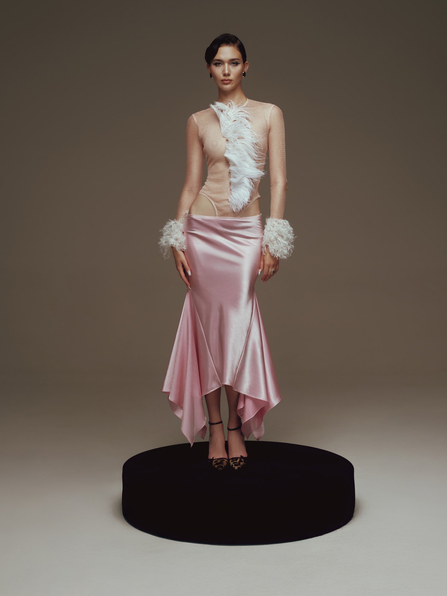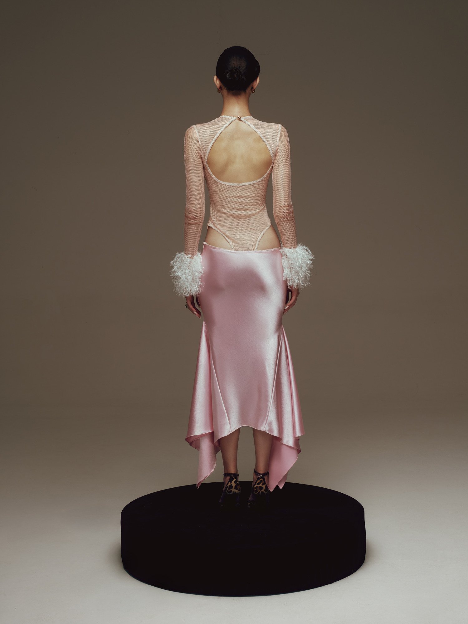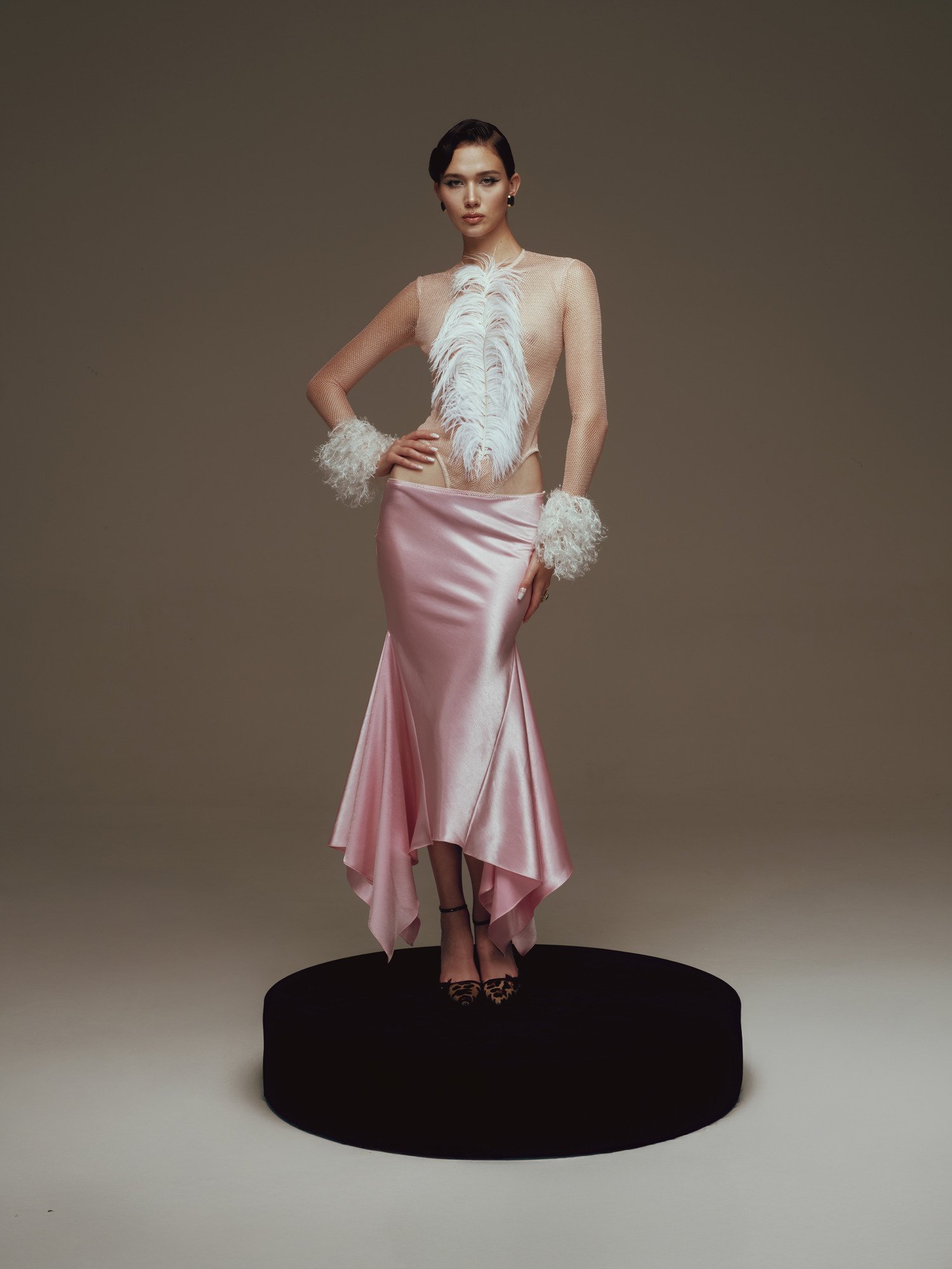 A fitted satin skirt with a diagonal cut that creates a natural drape, gently contouring the hips before flaring into a mermaid-like hem. The smooth, lustrous satin subtly catches the light, while the asymmetrical finish adds fluid movement and elongates the silhouette with every step.