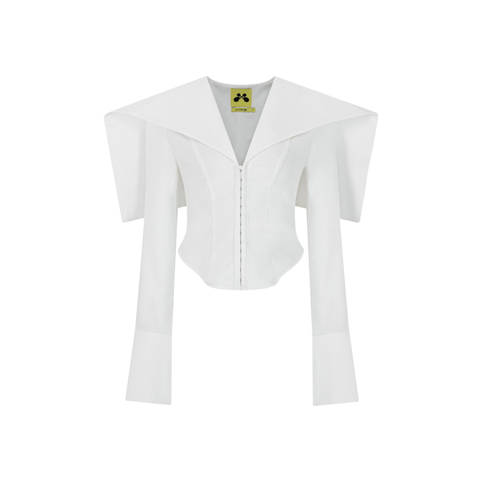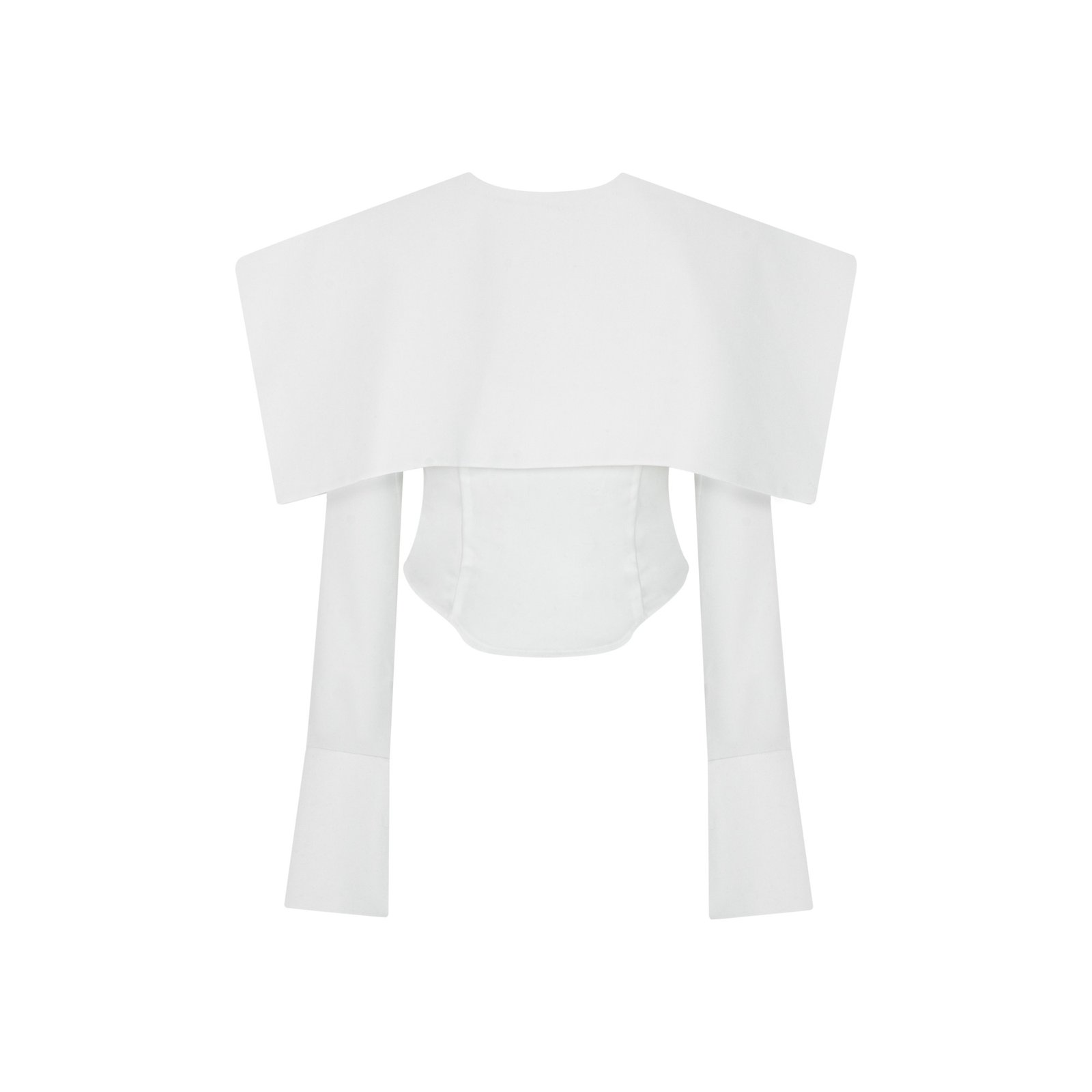 Under the European sunset, she appears like an ivory sculpture — bold, sharp, yet deeply feminine. Marinaia with its daring sculpted sailor collar and structured woven fabric, evokes the commanding grace of a modern lady draped in the spirit of classic cinema. Paired with a black lace skirt, the look becomes sensual without being ostentatious, free yet intentional — a symphony between shape and fabric, between the past and the present.
