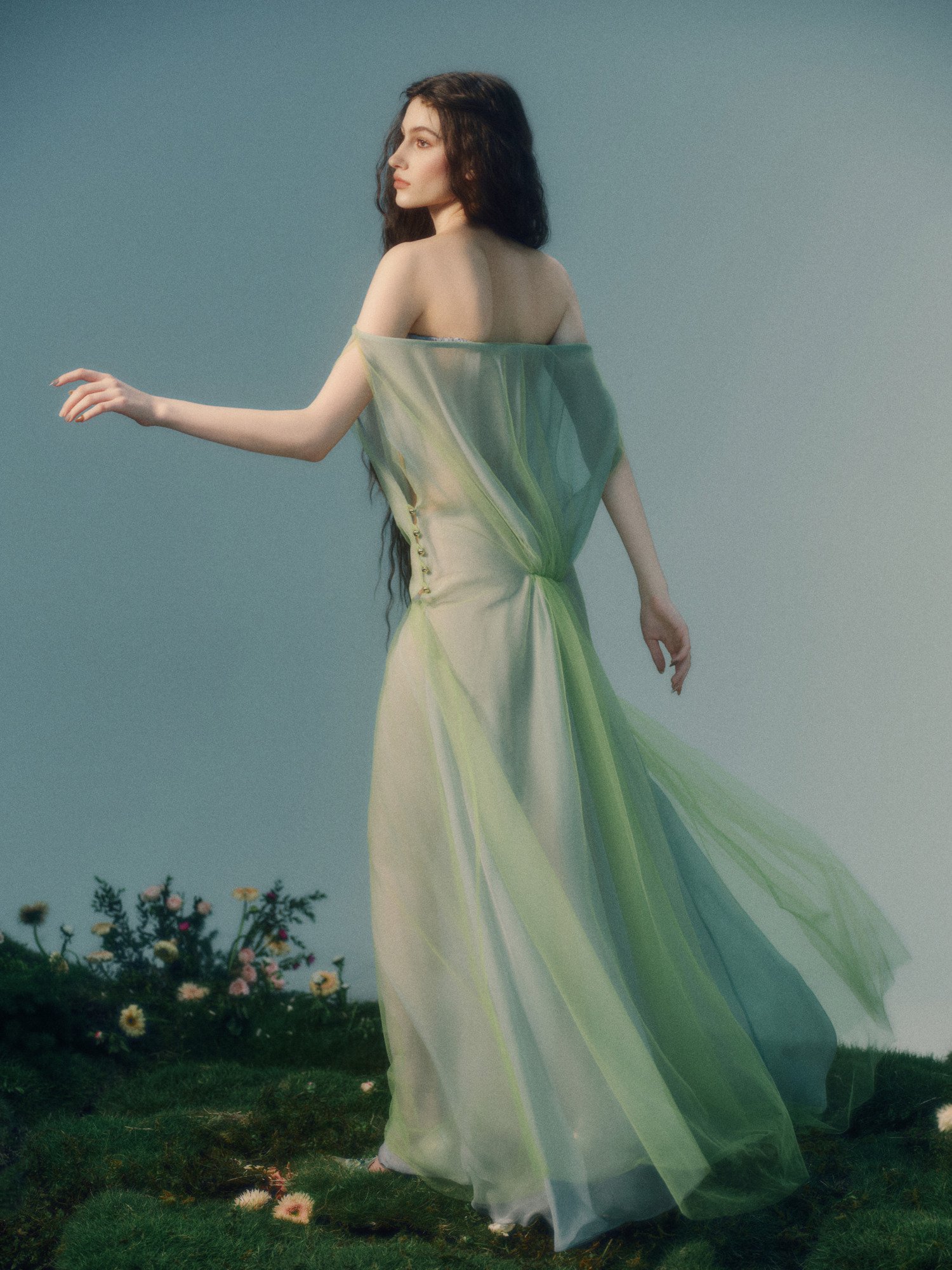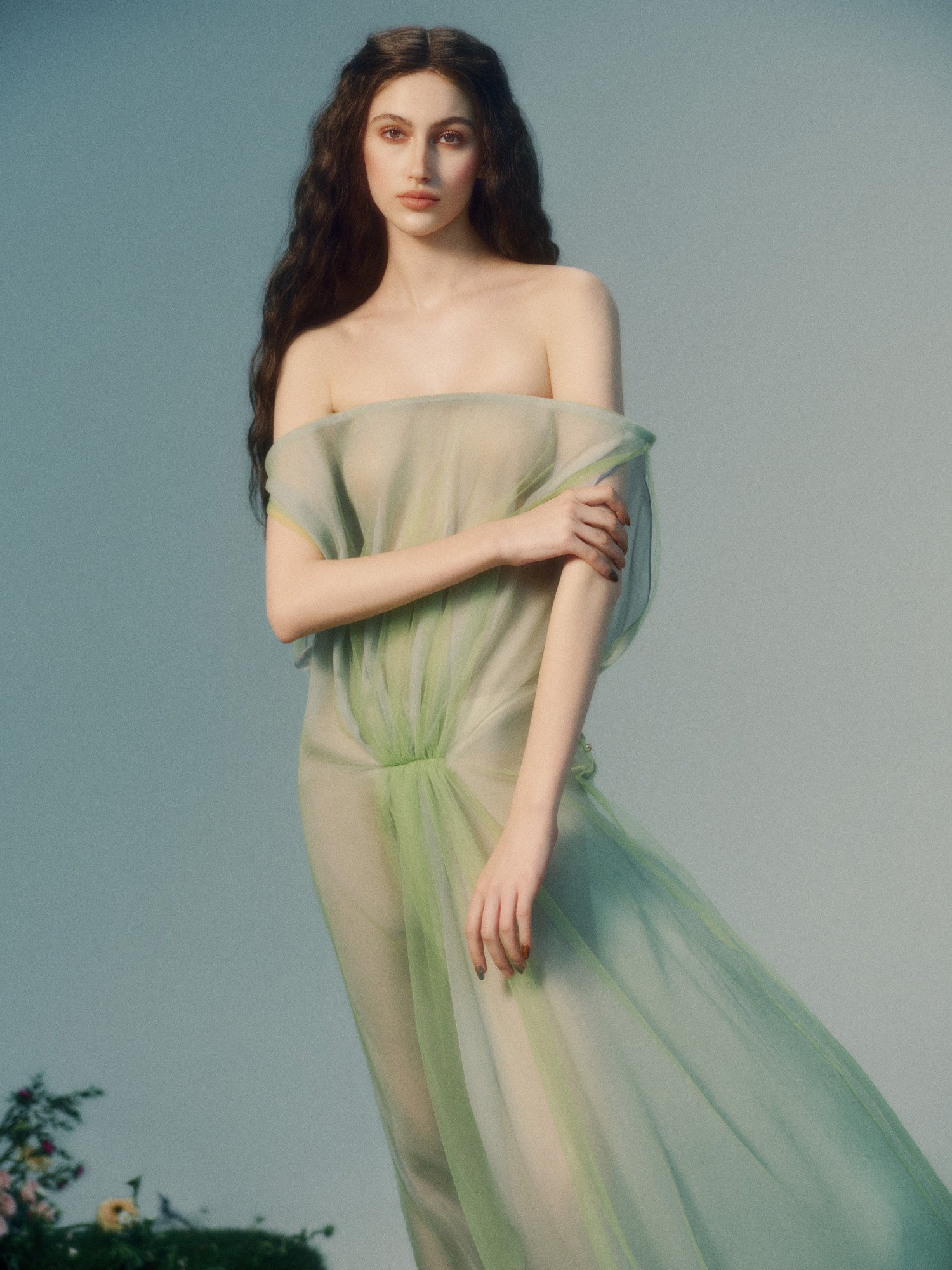 Like water in a gentle shimmer, Naiad emerges in sheer, drifting layers that barely cling to the body, the silhouette no longer held but carried by movement. Each fold ripples like a surface just touched, softening every line until it almost disappears – something not yet formed, fleeting, as if it could dissolve the moment you try to hold it.