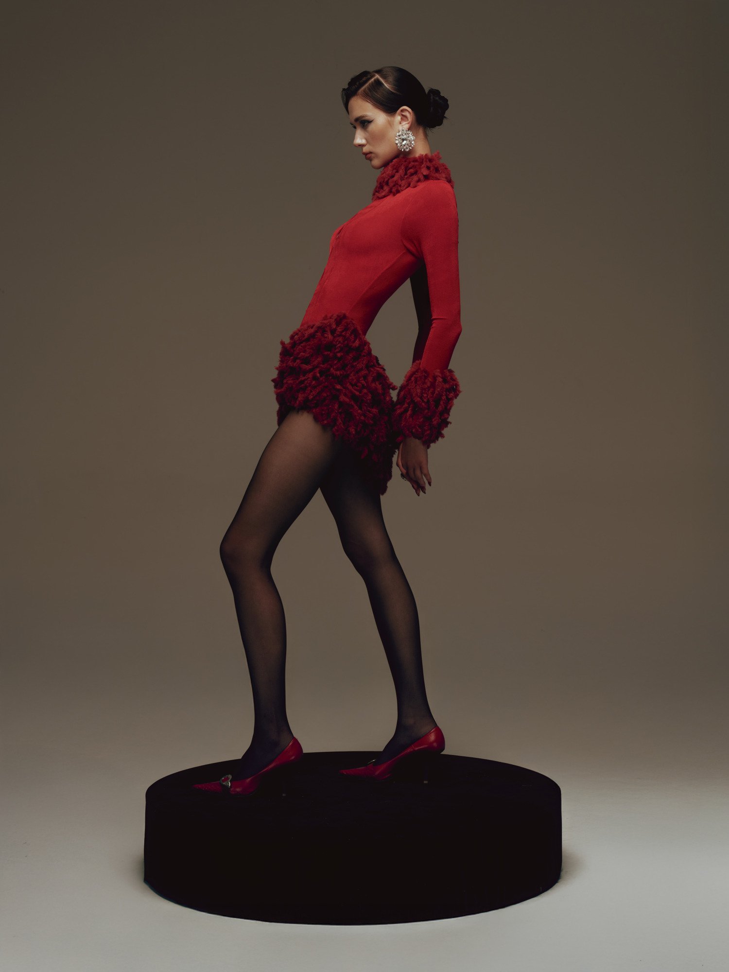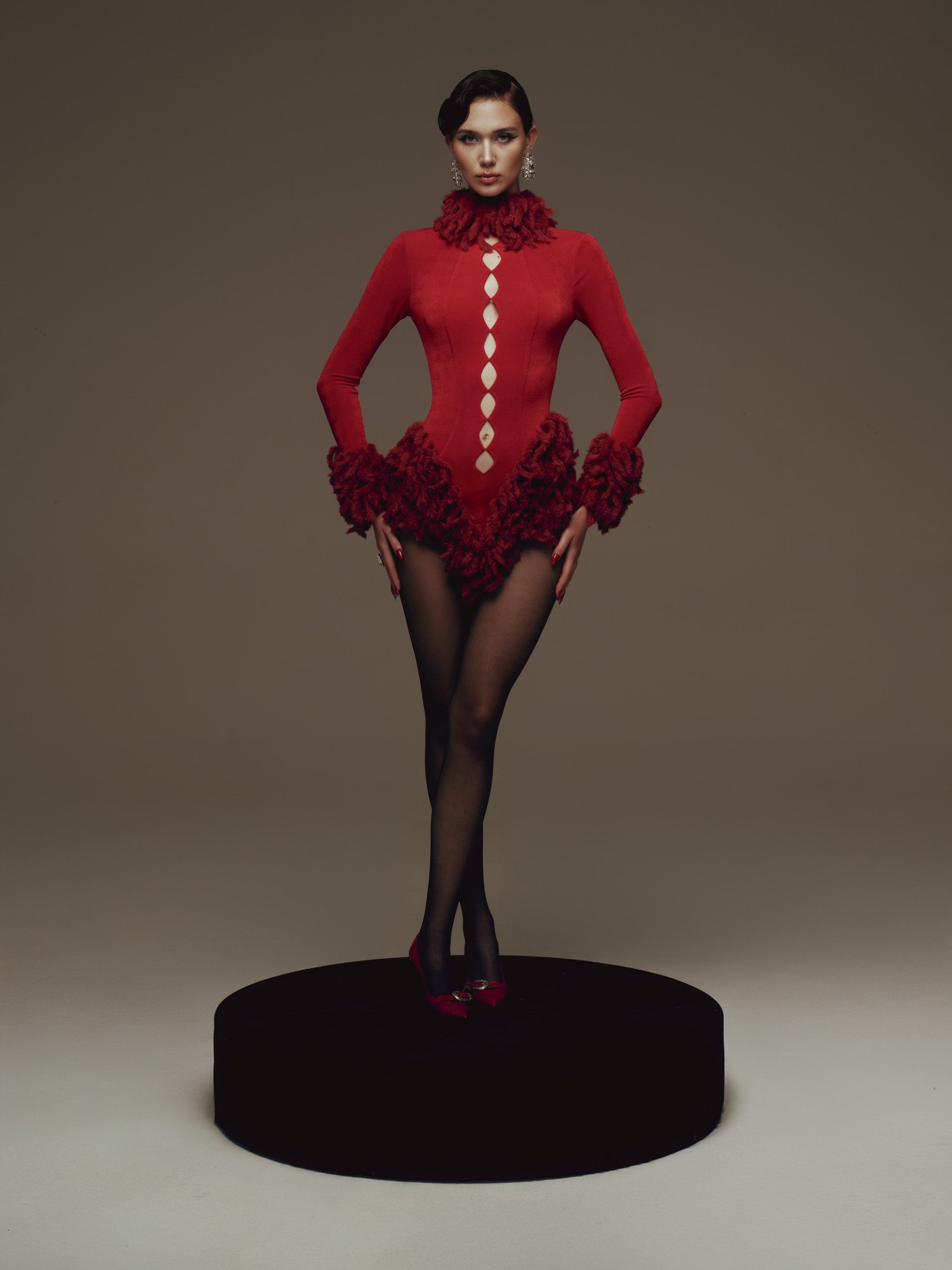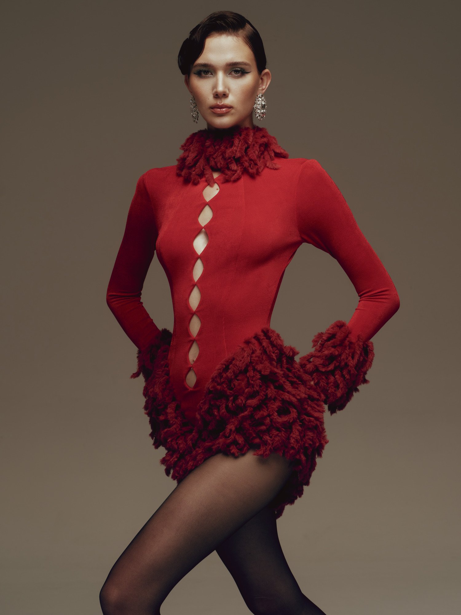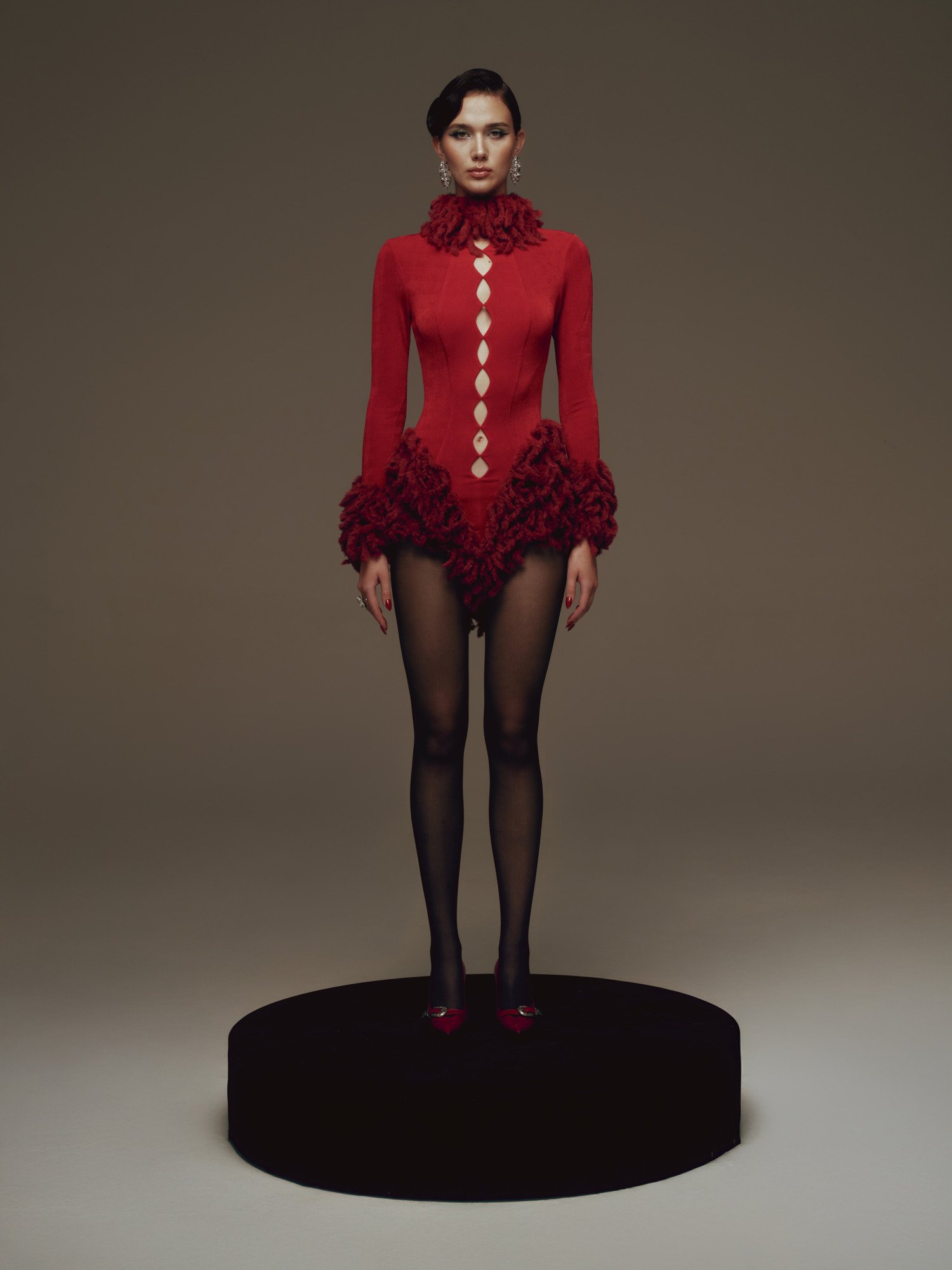 A figure-hugging design with a high neckline adorned with feathers that sculpt volume around the neck and along the hem, emphasizing an hourglass form. The front features a diamond-shaped cutout running vertically along the center, adding a sensual edge. Long, fitted sleeves finished with feathered cuffs create a cohesive sculptural line from top to bottom. The overall effect is sharp and provocative, yet tightly controlled through precise tailoring.