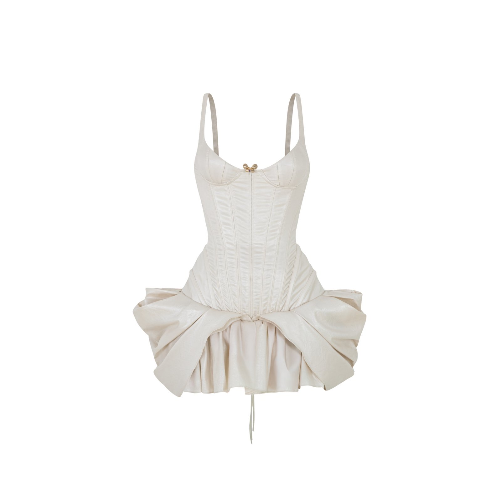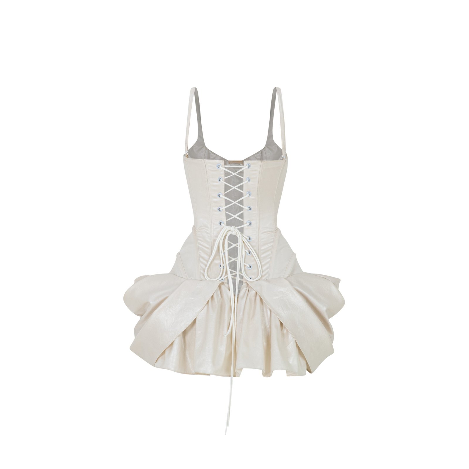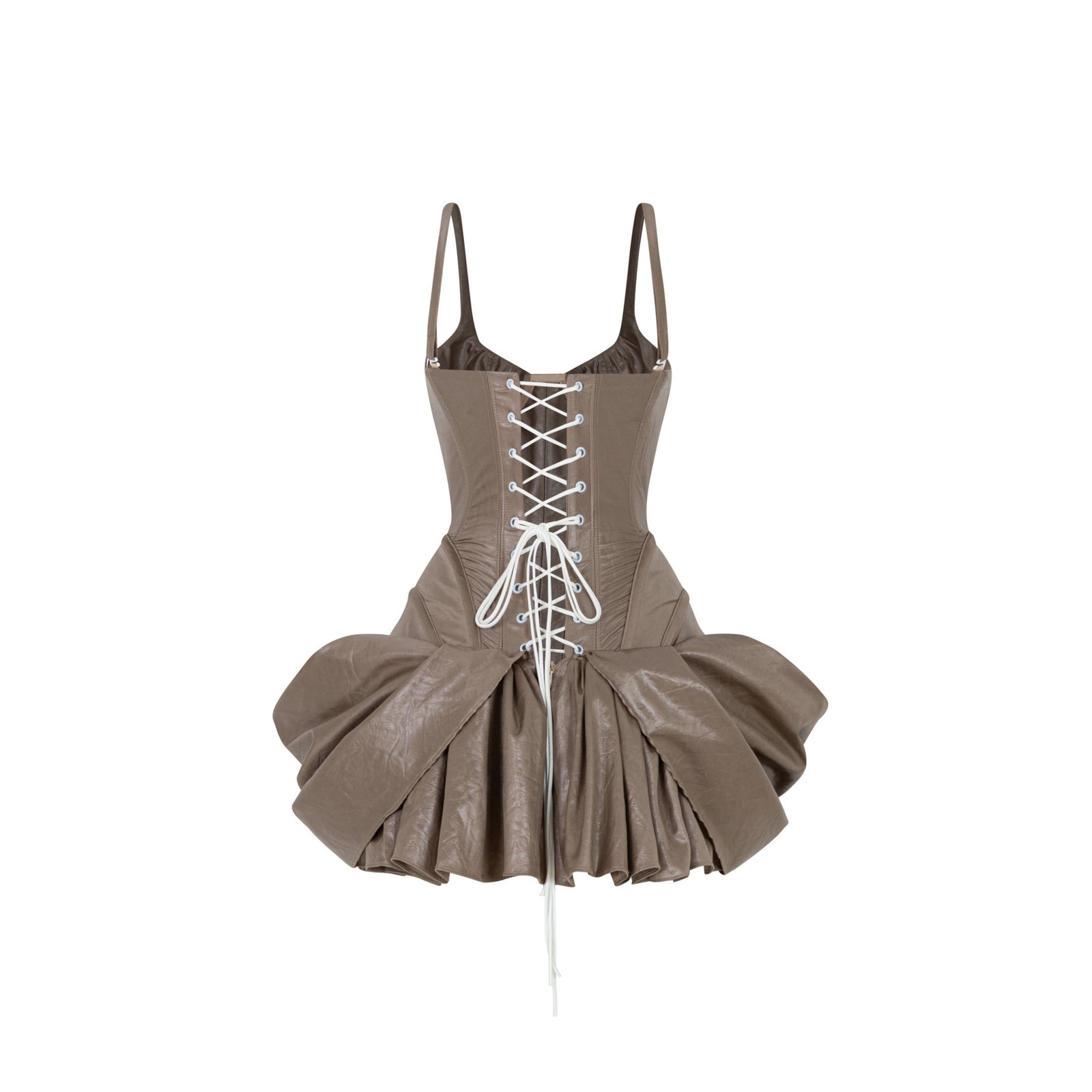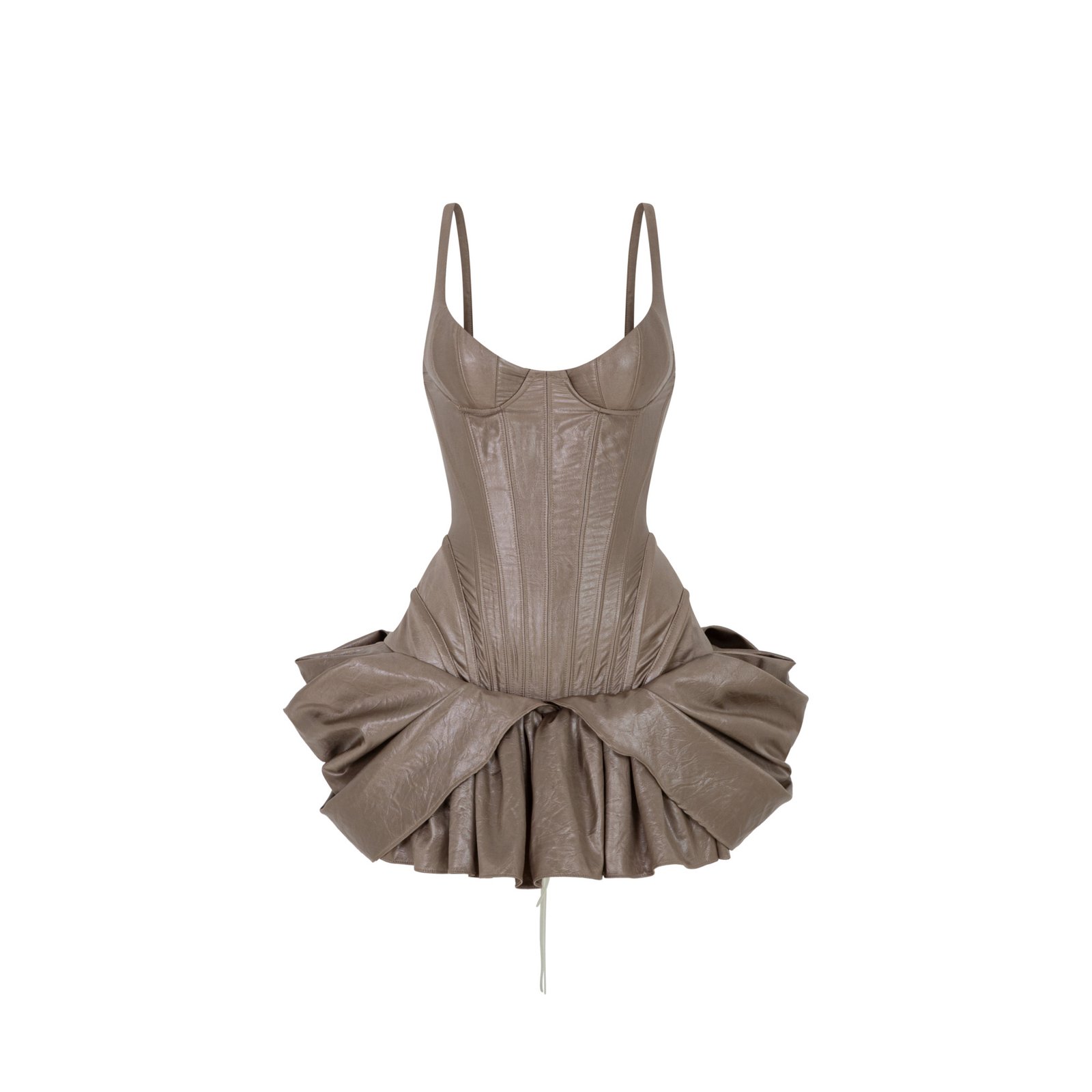 Perla shimmers like a precious gem beneath the Mediterranean dusk — sweet, yet strikingly bold. The lustrous faux leather clings to every curve like a seashell’s gleaming shell, sculpting her silhouette with quiet pride. With its sculpted corset and rippling hem, she stands like a goddess carved in stone — still, but seductively alive. One glance, one fleeting moment — and time forgets to breathe.