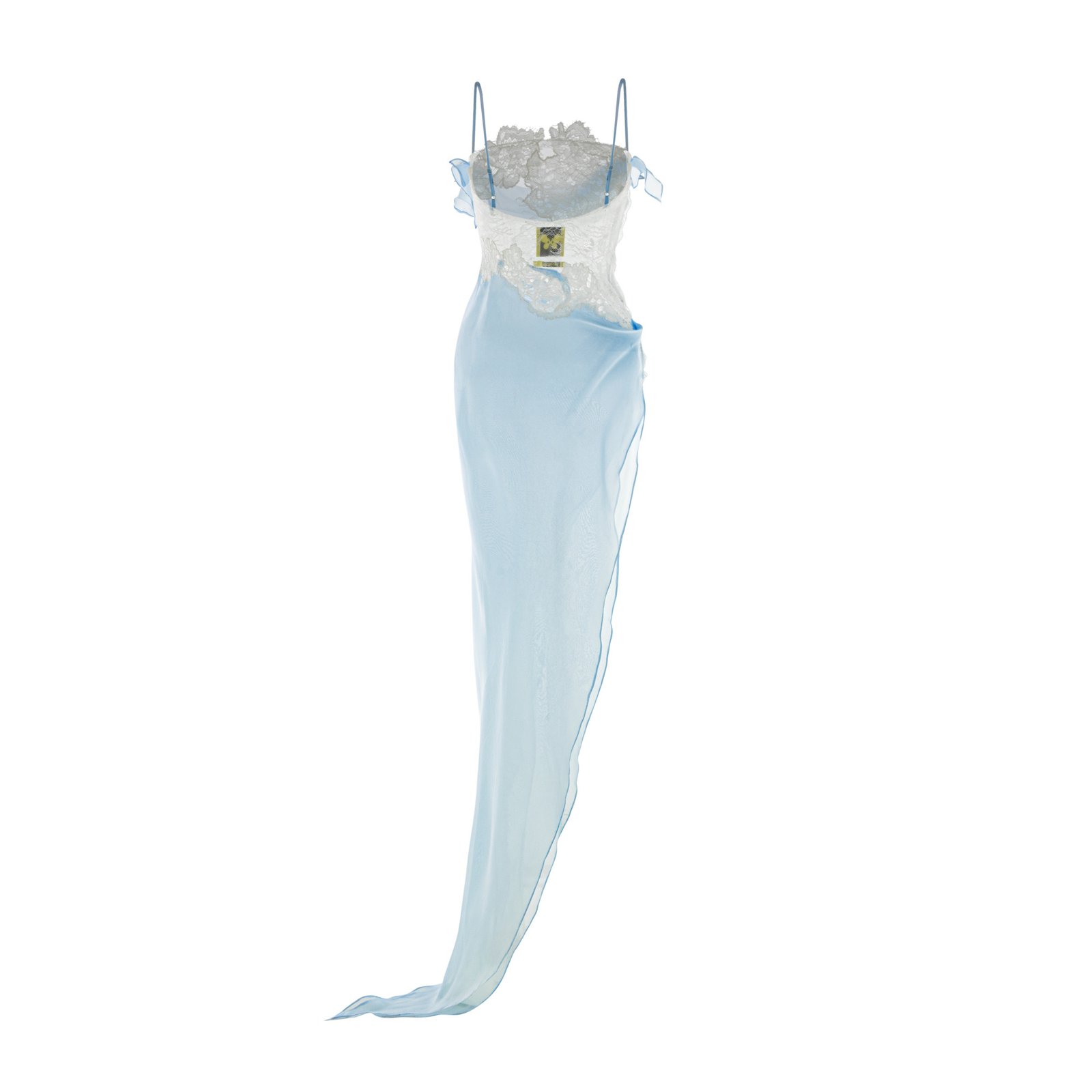 Close your eyes and imagine: you, a field of flowers, the crisp autumn breeze gently caressing your skin—that’s the feeling Ventosa brings. The delicate white lace paired with the soft blue sheer fabric resembles a light mist floating across the vast blue sky. The asymmetrical design with its daring thigh slit enhances Ventosa’s allure, making it a symbol of refined elegance and sensuality.