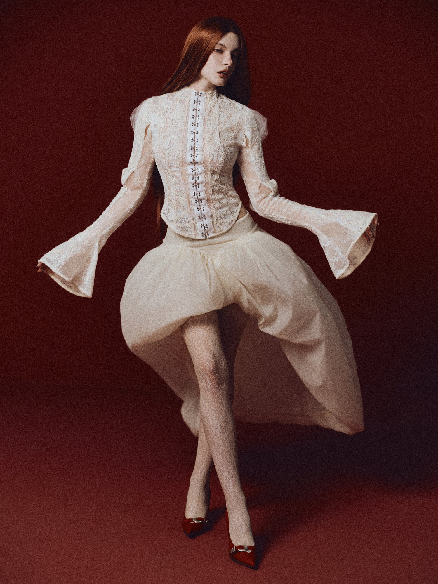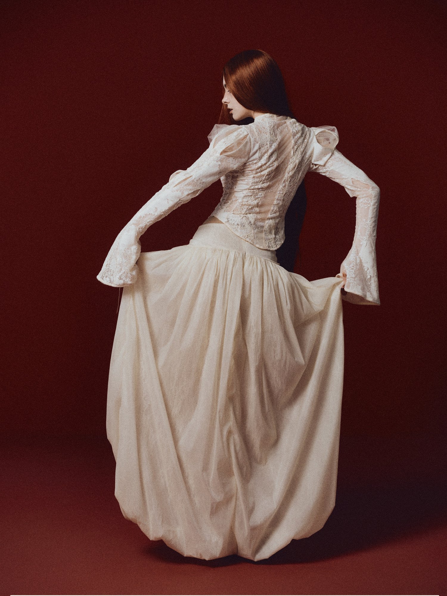 The Elizabeth Top is a deconstructed shirt reassembled from various lace fabrics with different motifs, creating an intricate patchwork effect. It features a high neckline with a front hook-and-eye closure and long sleeves finished with elegant flared cuffs.