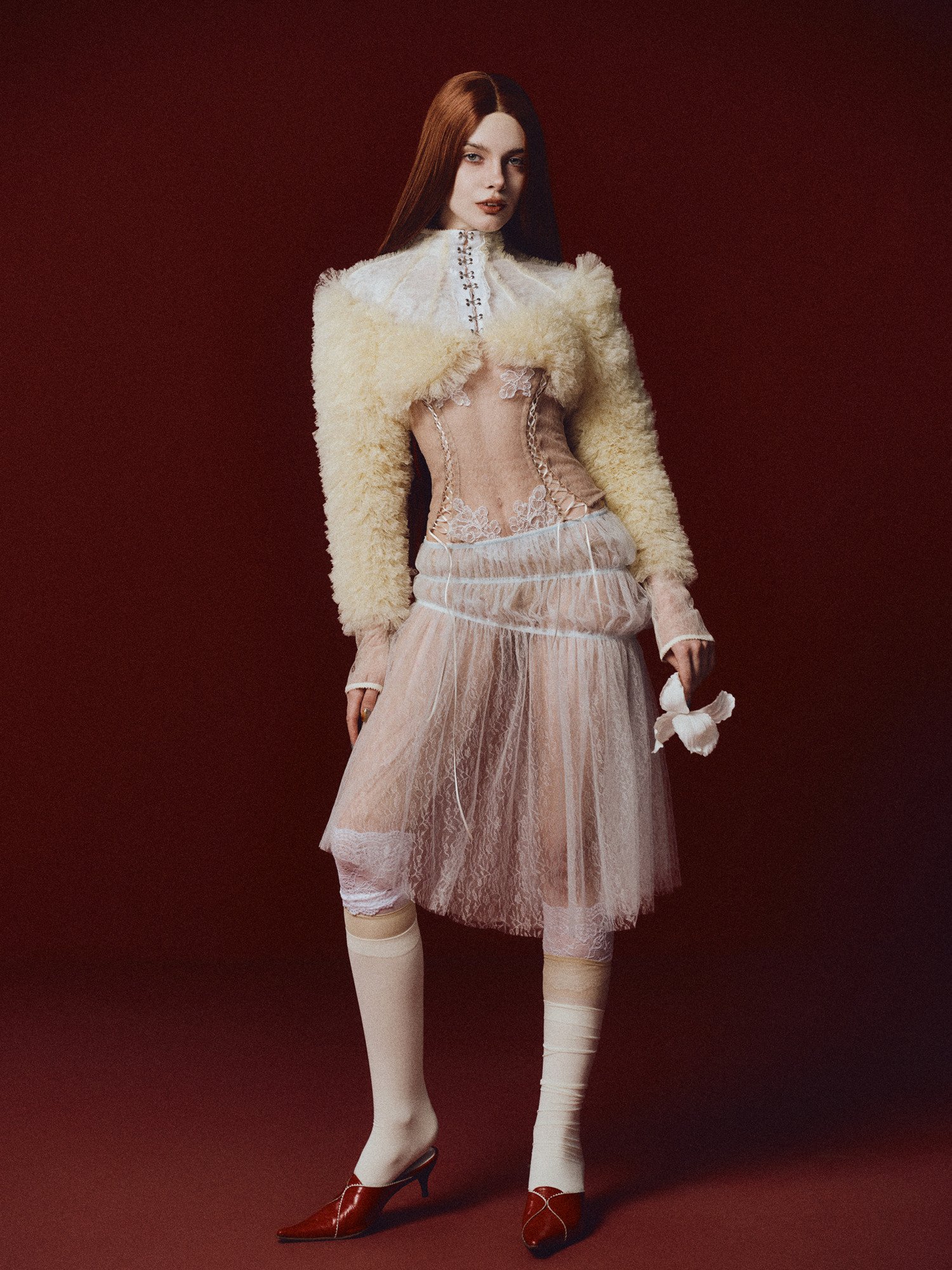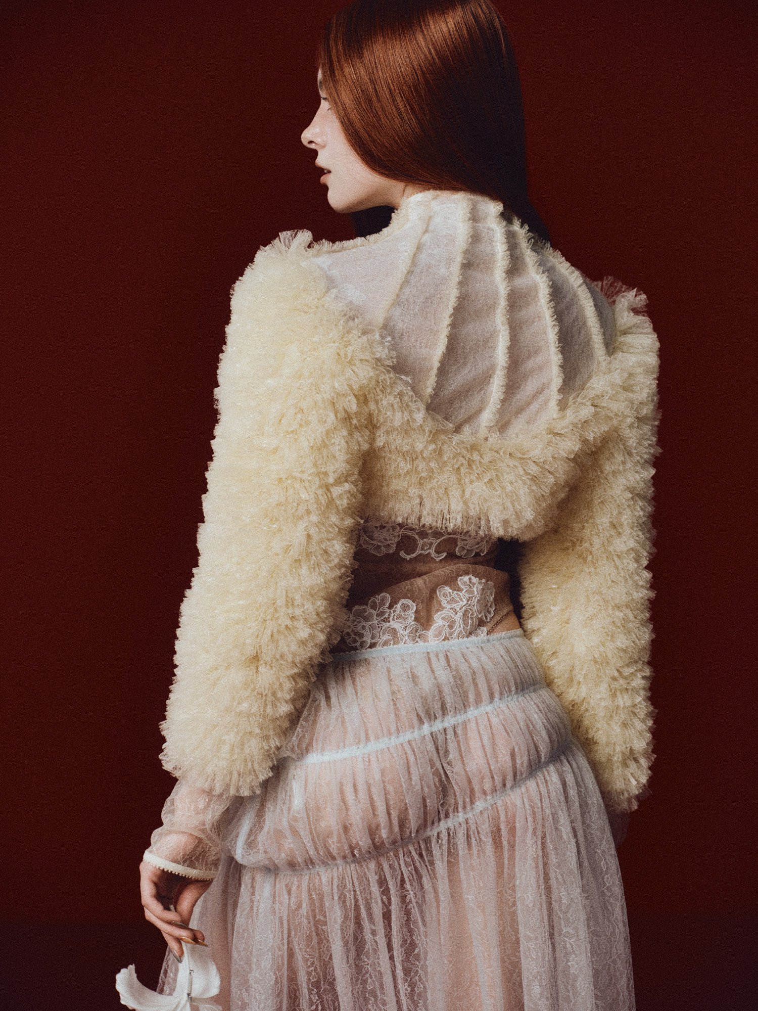 The Sonnet XVIII Cropped Jacket is a pale yellow bolero-style piece adorned with ruffled lace appliqués across the surface, creating a faux-fur effect. This design plays with contrasting textures — soft vs. structured, opaque vs. sheer — for a visually striking finish.