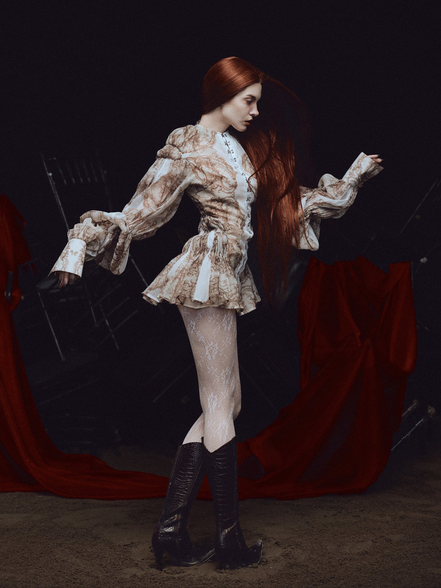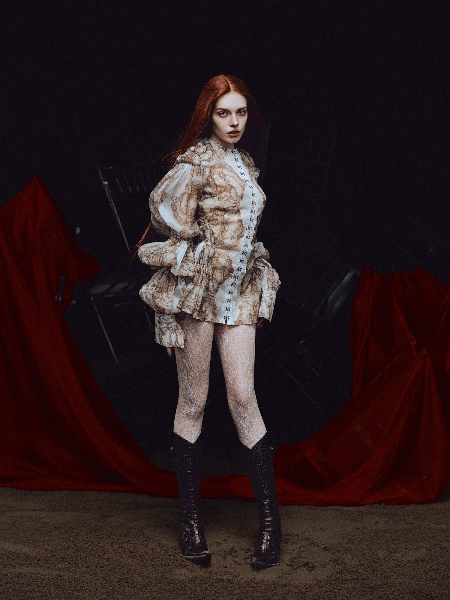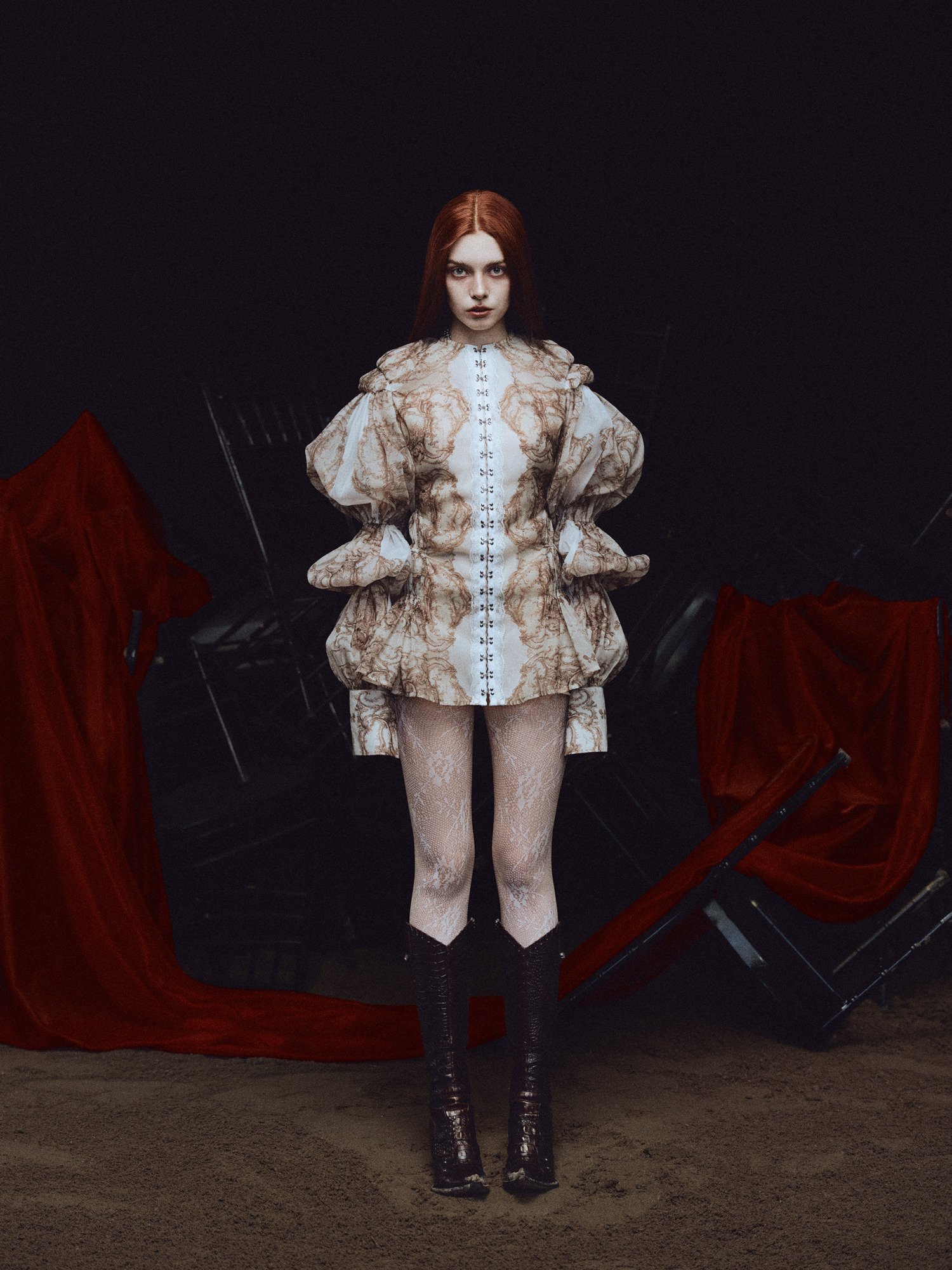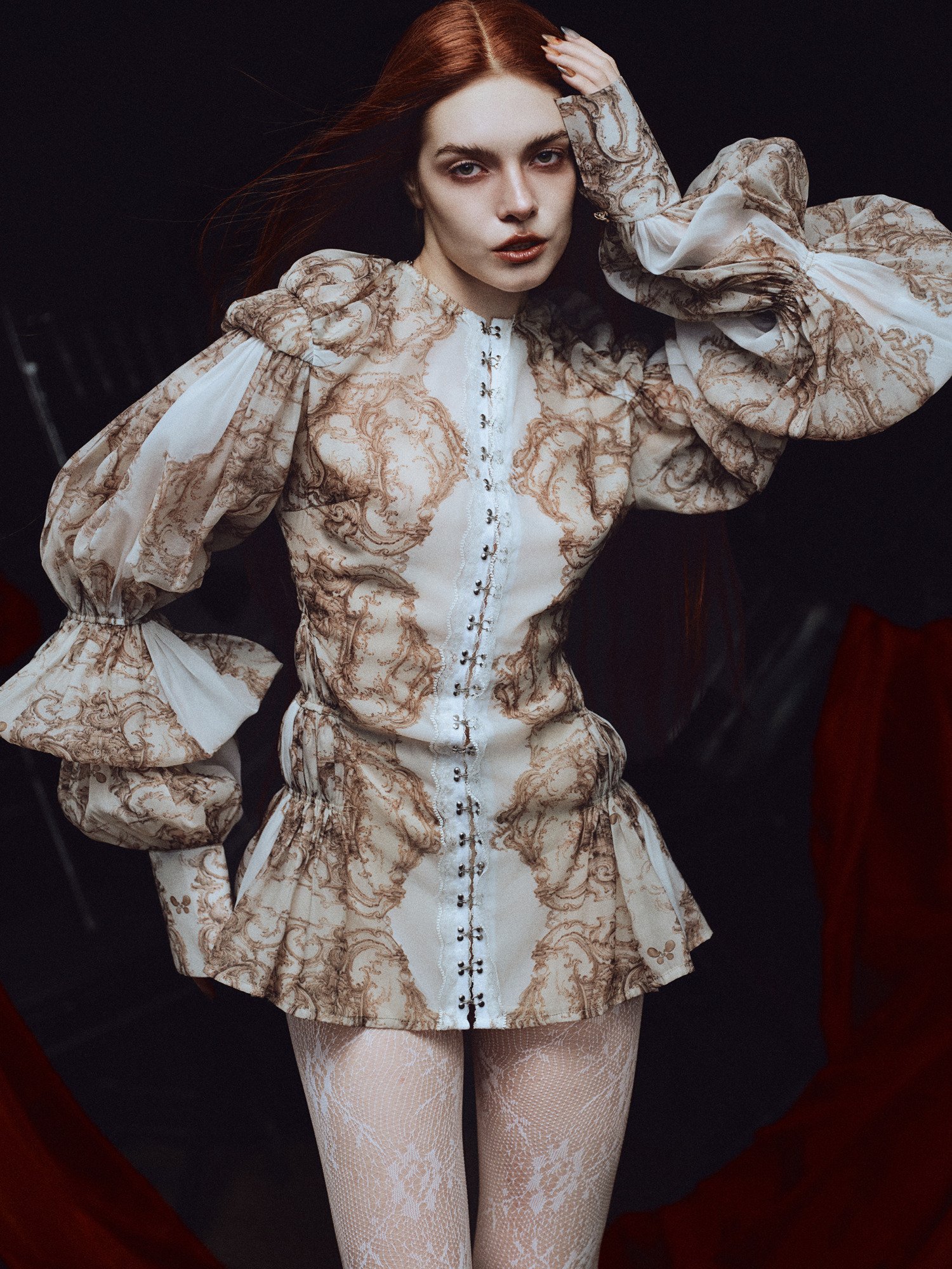 The Bellona Dress is a mini dress with a subtle fit-and-flare silhouette, highlighted by dramatically exaggerated bishop sleeves that are voluminously rounded for a striking effect. The entire fabric surface is adorned with an exclusive Baroque print, symmetrically aligned along the center axis to emphasize the button placket running down the front. The ornate print evokes the artistry and architecture of 17th–18th century Europe, while the modern mini length creates a bold contrast between romantic classicism and contemporary rebellion.
