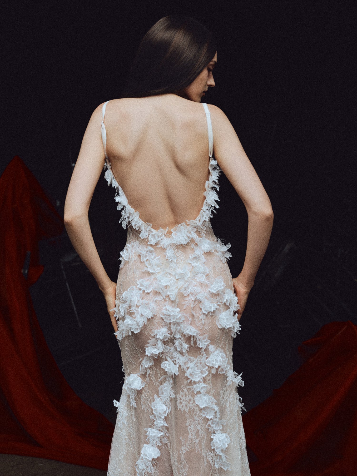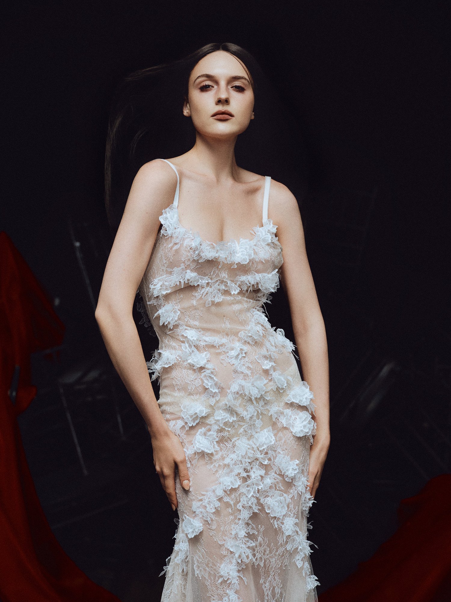 The Swan Song Dress is a sheer slip dress with delicate spaghetti straps, constructed on a transparent lace base. The entire body is adorned with 3D lace floral appliqués that appear to bloom and scatter organically across the figure. These floral clusters flow naturally from the bust down the front, hips, and back, giving the dress a soft yet sensual allure. The deep, figure-hugging open back accentuates the silhouette, while the subtly asymmetrical hem drapes fluidly for a light, airy effect. Altogether, the design evokes the image of a blooming garden unfurling across the skin.