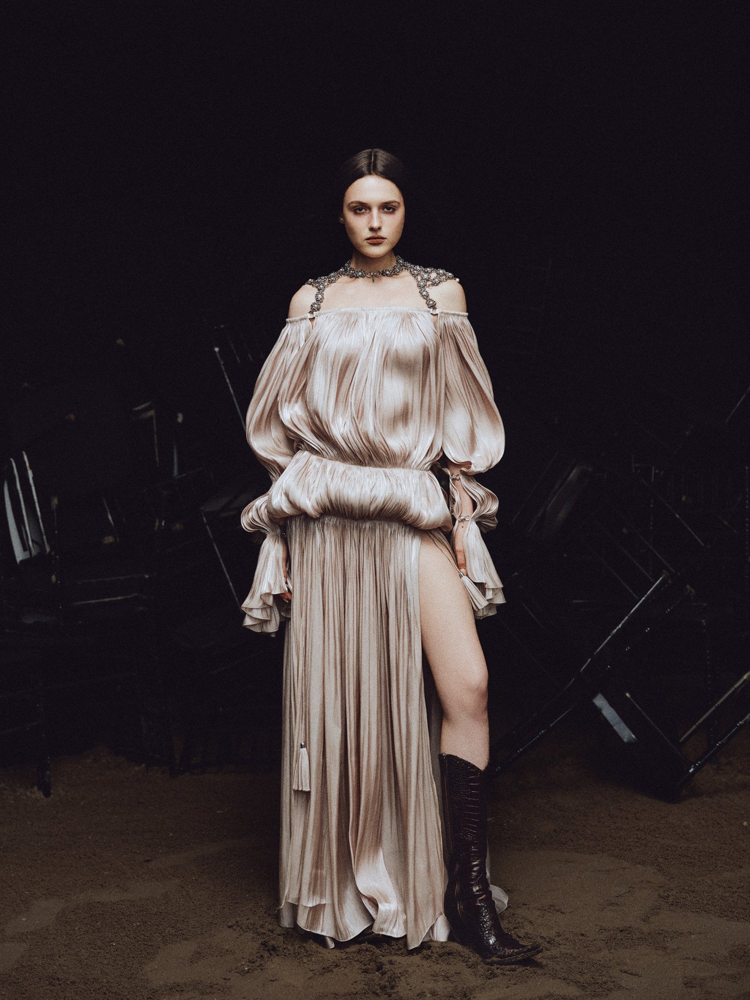 The Tempest Dress features an off-shoulder, elasticated bodice paired with dramatic oversized bishop sleeves that flare elegantly at the cuffs for a theatrical effect. The shoulders are adorned with beaded chain embellishments, functioning as integrated jewelry accents. The long, floor-grazing skirt is designed with a high front slit, maintaining a fluid, graceful silhouette.