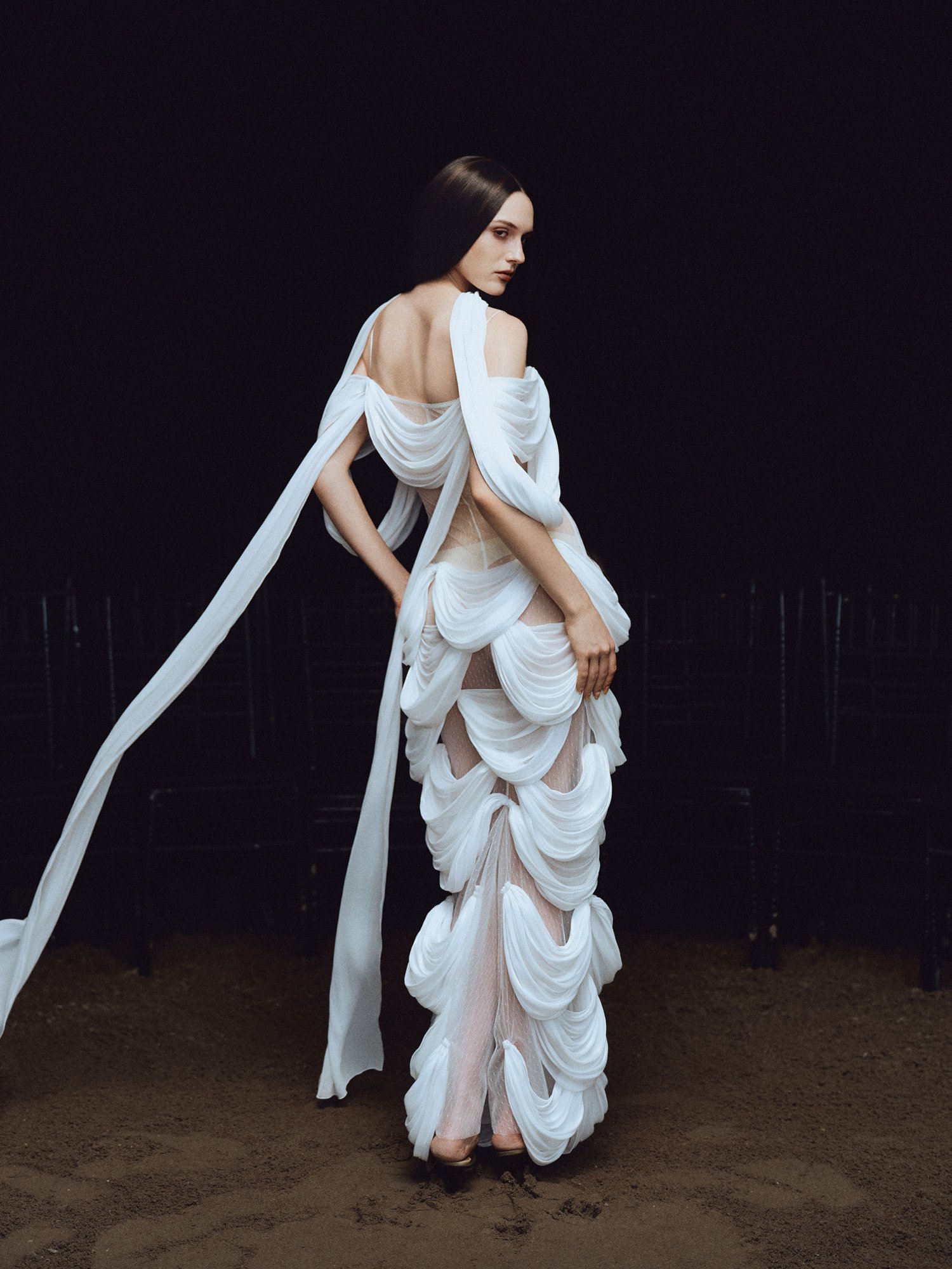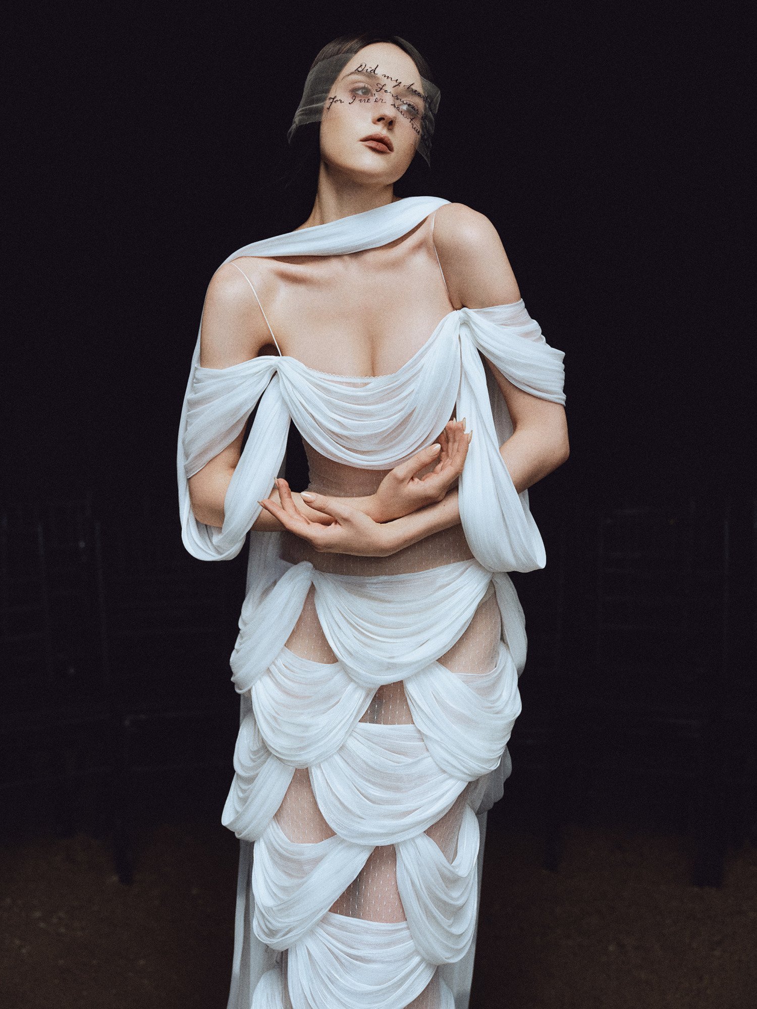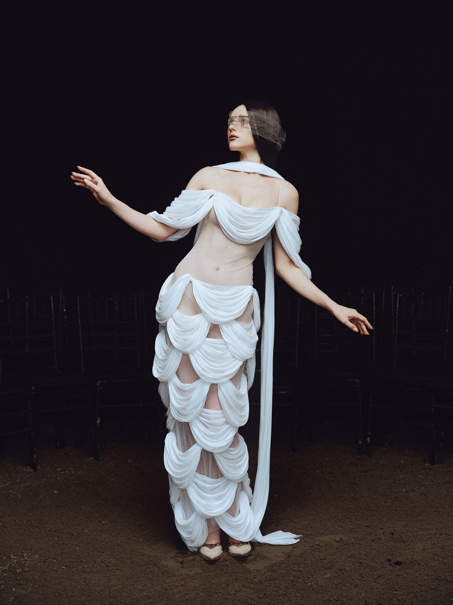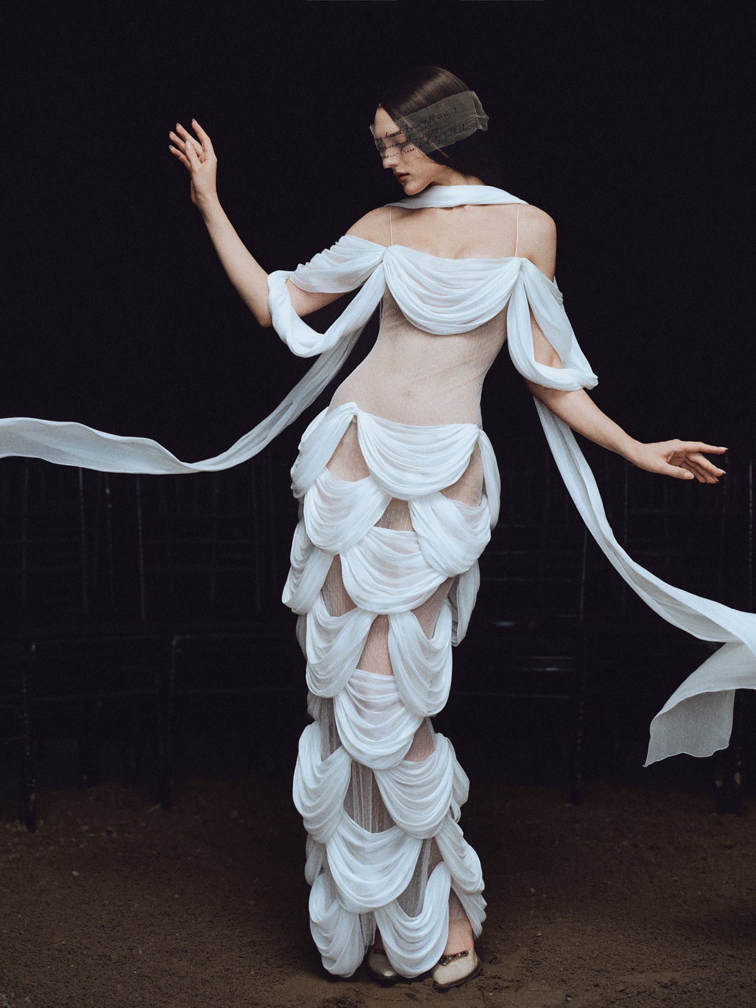 The Lady Macbeth Dress is a sculptural evening gown featuring a body-hugging inner layer made of sheer mesh, overlaid with multiple layers of white chiffon draped into fluid, curtain-like folds. The off-shoulder neckline, bust, and arms are shaped with soft, romantic drapery, accented by trailing chiffon ties that flow freely, creating a dreamlike sense of movement.