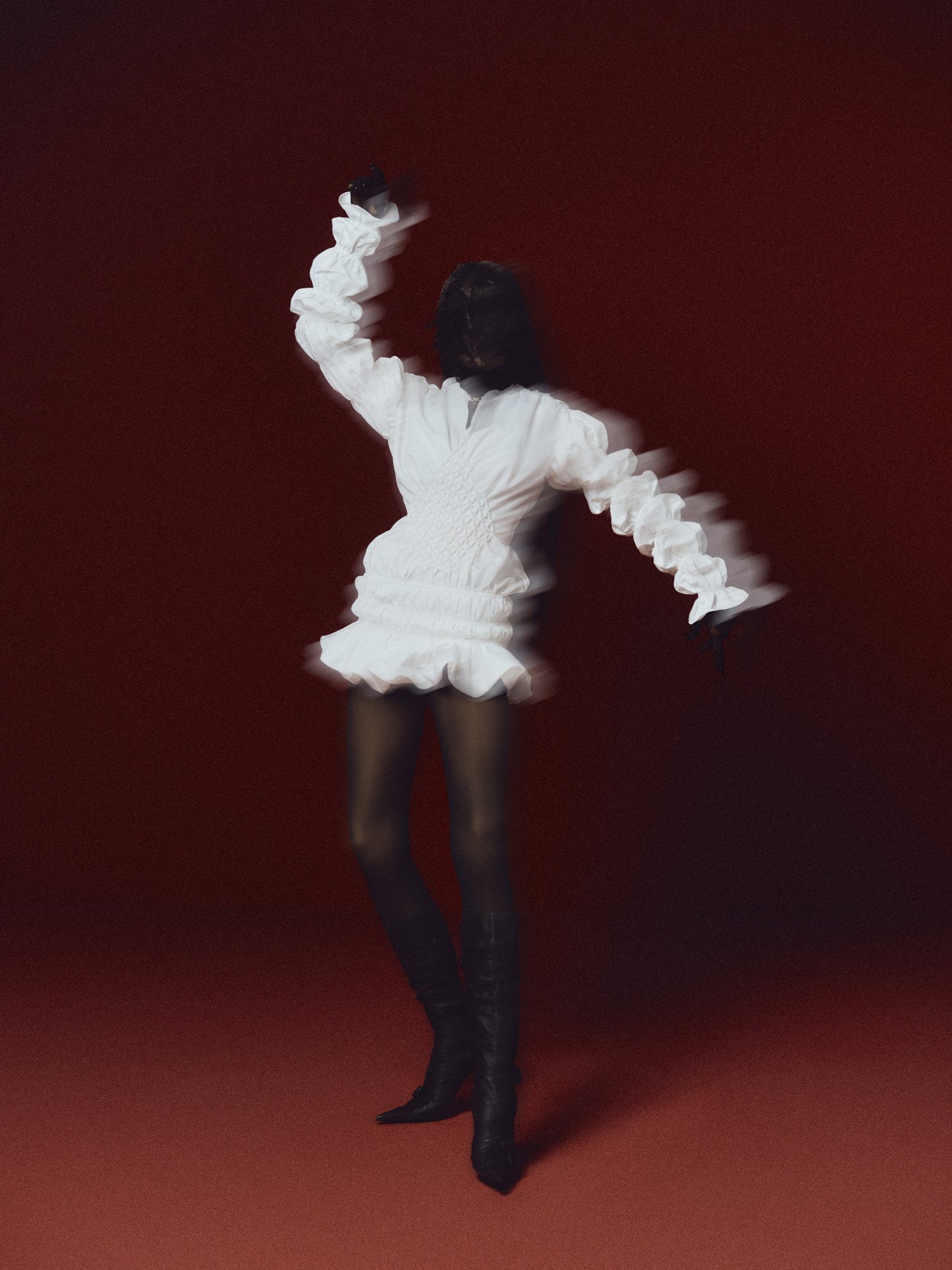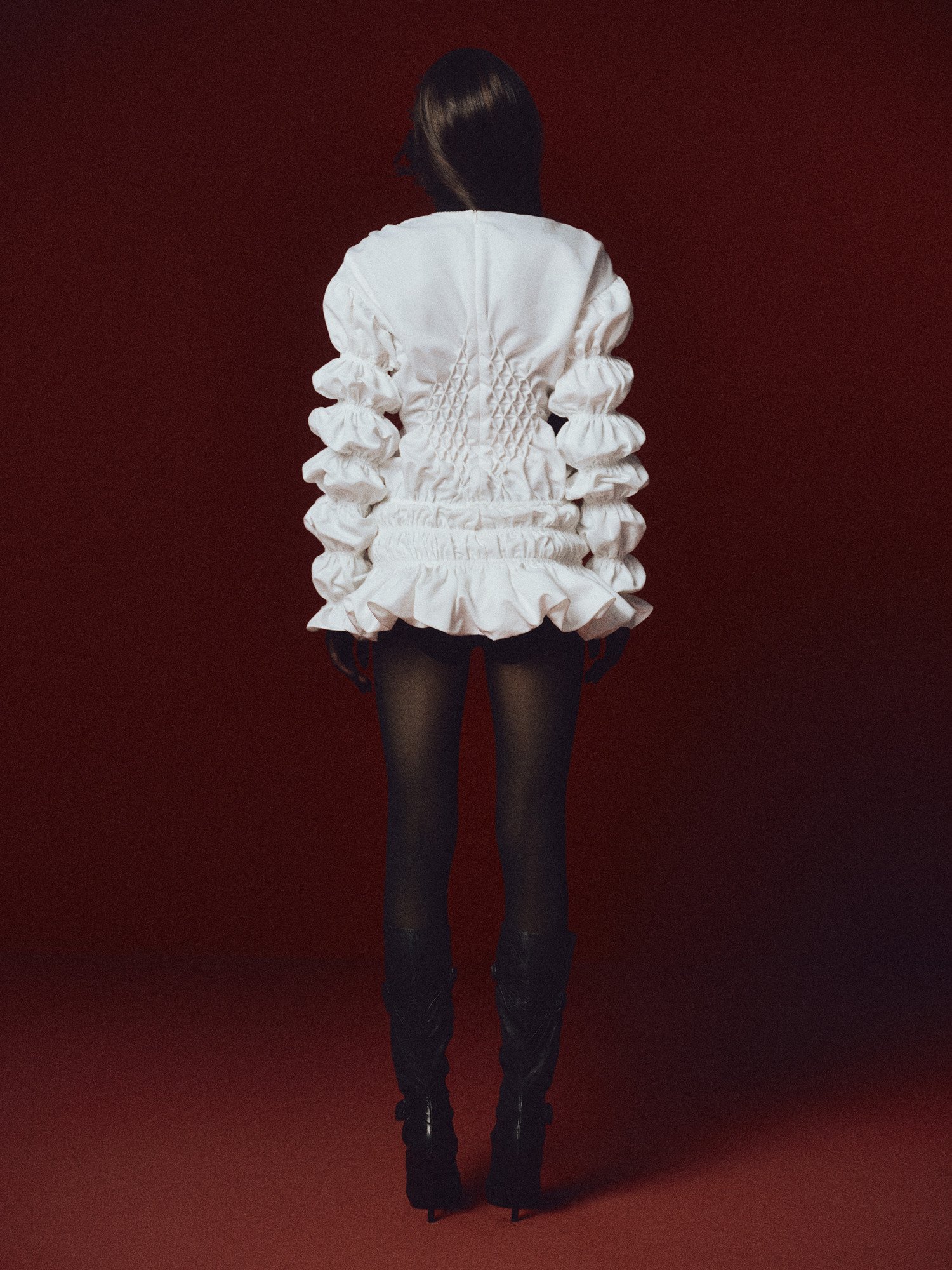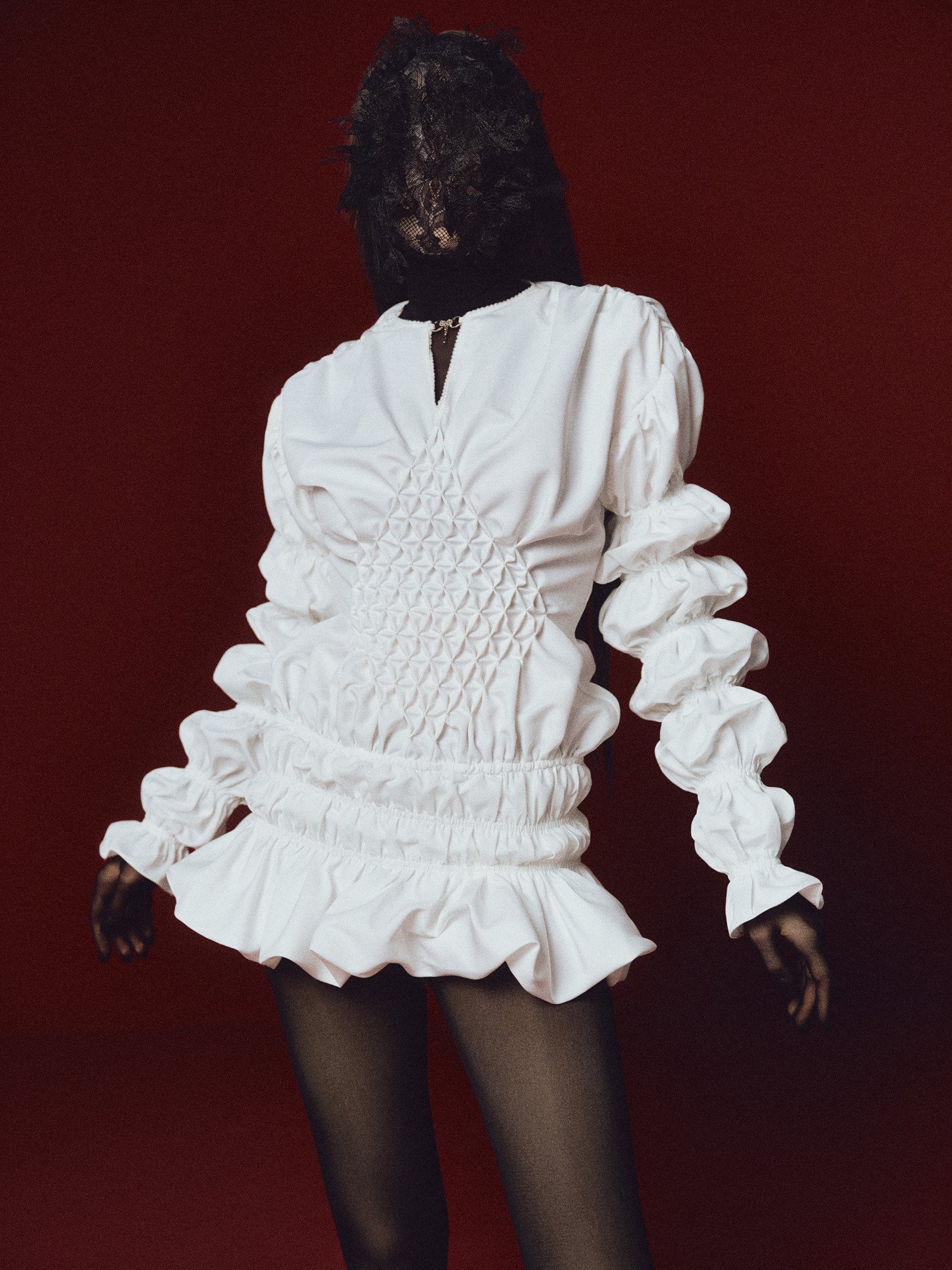 The Swan of Avon Dress is a mini bodycon silhouette distinguished by intricate hand-crafted diamond smocking on the front and back bodice, creating a naturally stretchy, form-hugging effect. The long sleeves feature layered ruching for a sculptural yet soft, voluminous look, while the wide ruffled hem adds balance between strong structure and feminine charm.
