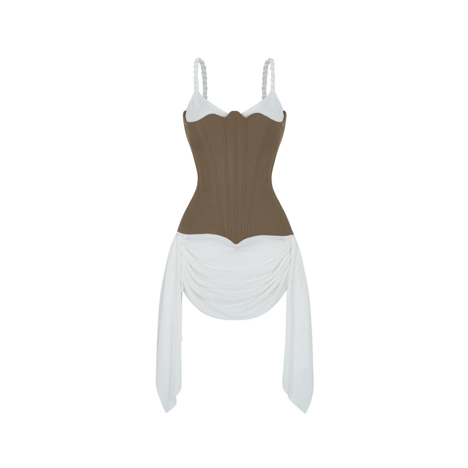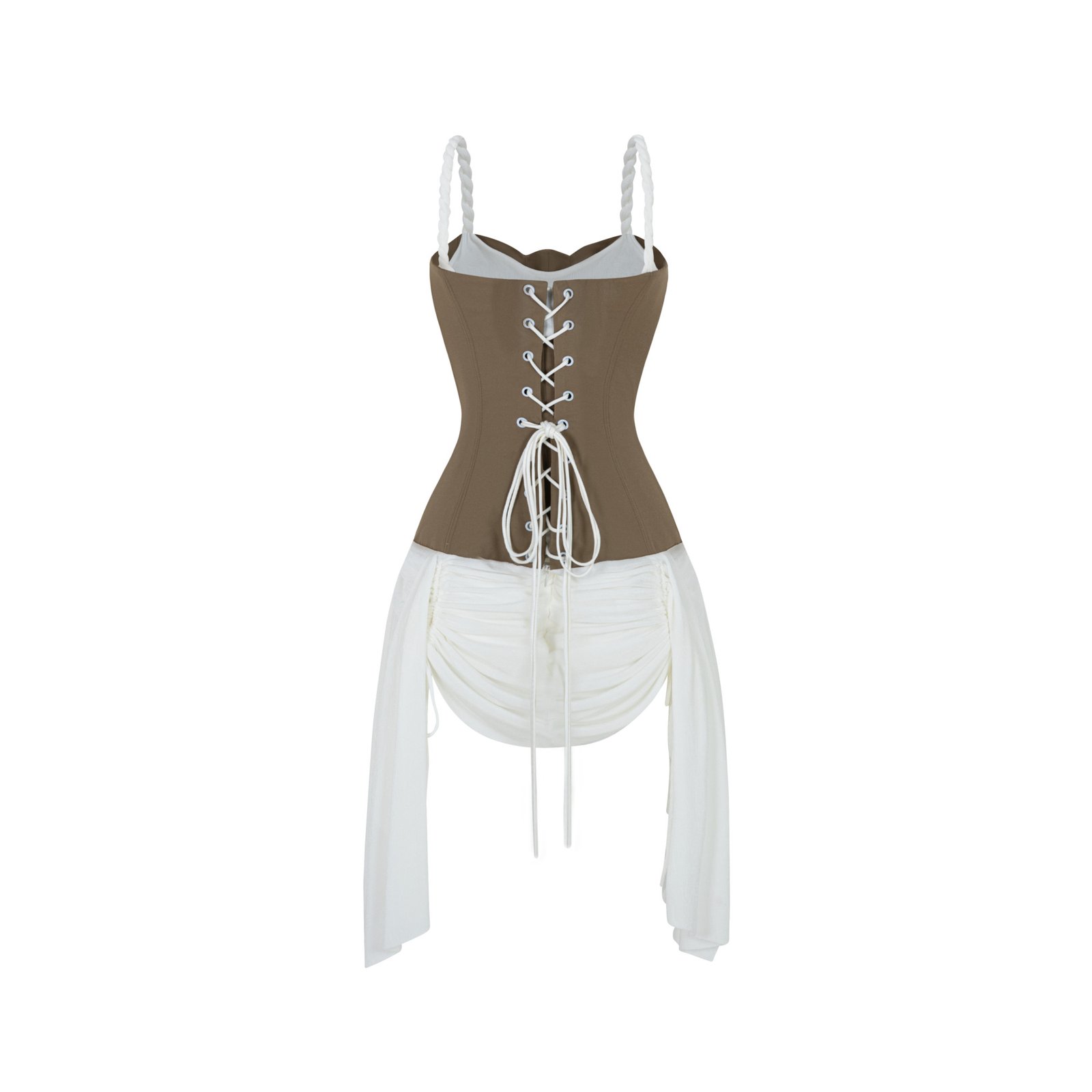 The Elysian Dress is a fusion of art and fashion, embodying the essence of the Belle Époque era. The sculpted corset, with its fluid curves inspired by Art Nouveau, enhances a soft yet commanding femininity. The draped skirt flows gracefully, reminiscent of the grand curtains in opulent castles. Every detail celebrates the elegance and pride of a woman, transforming her into a living masterpiece.