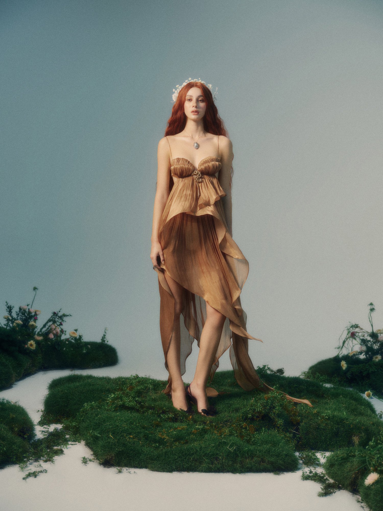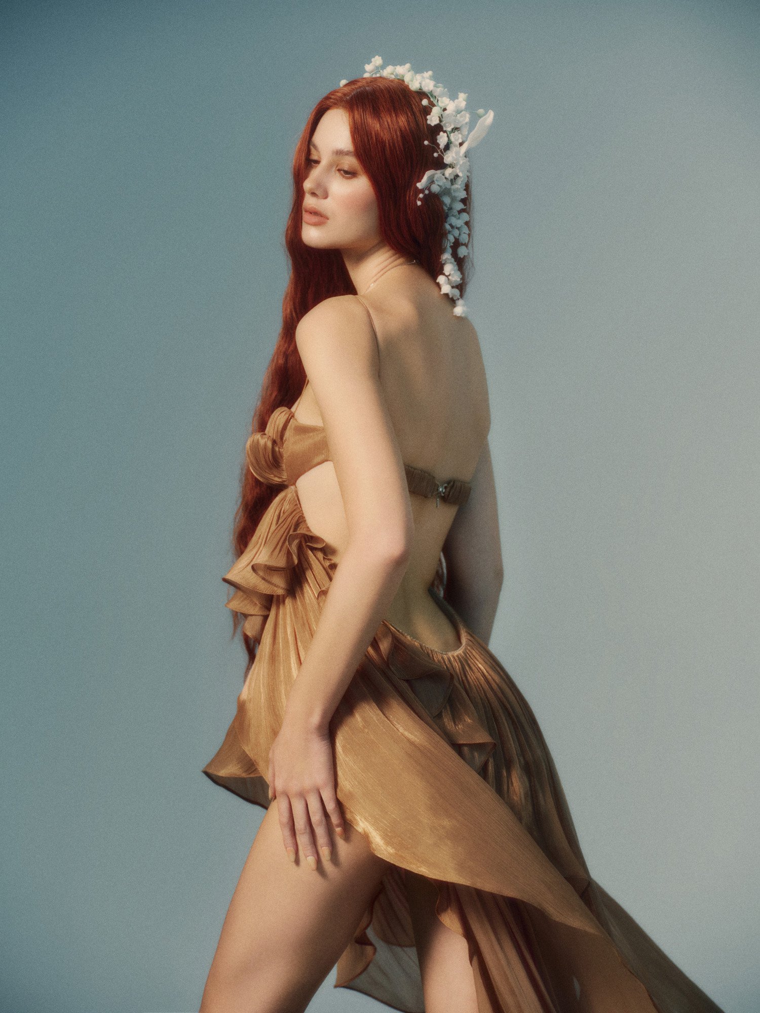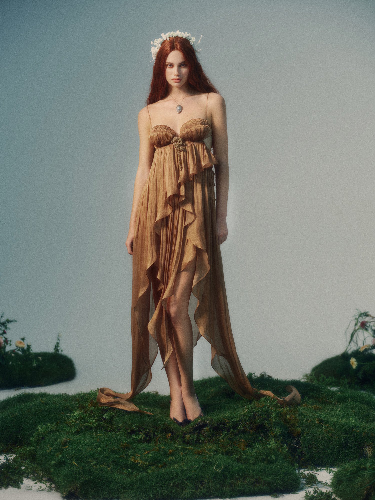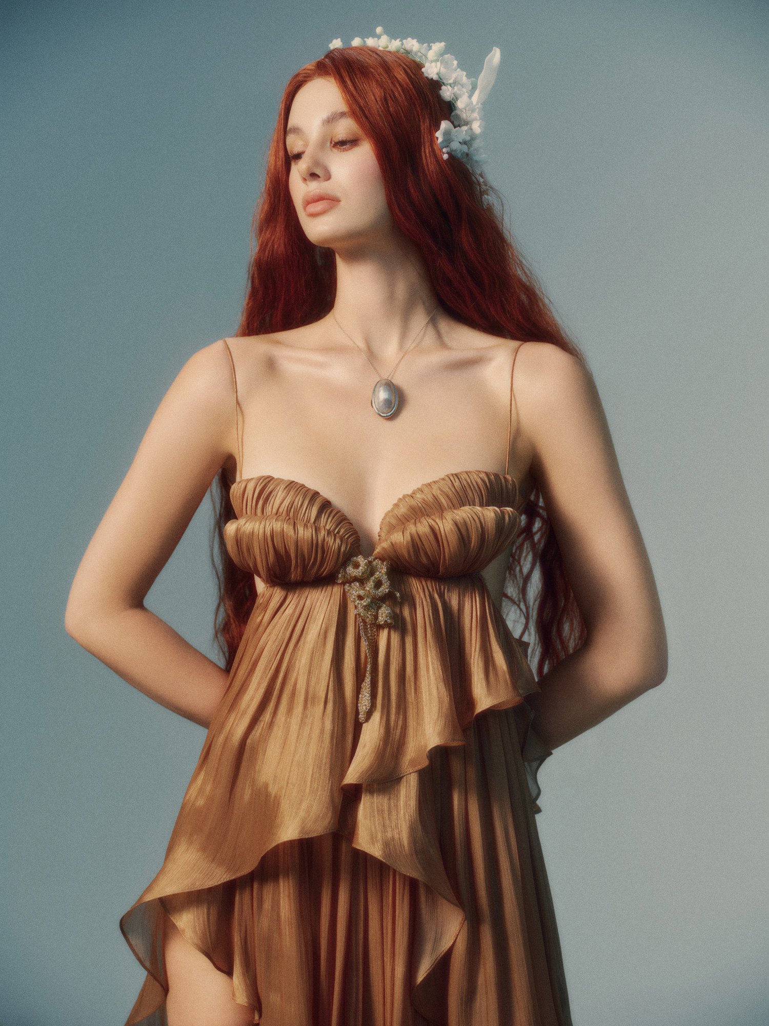 A warm brown hue envelops the body like earth cradling a seed – quiet, yet deeply nurturing. Layers of softly draped silk fall and sway in the breeze, evoking a movement so subtle it feels like life stirring beneath the soil. This is Rhea – the Mother of the gods, the origin from which all life begins.