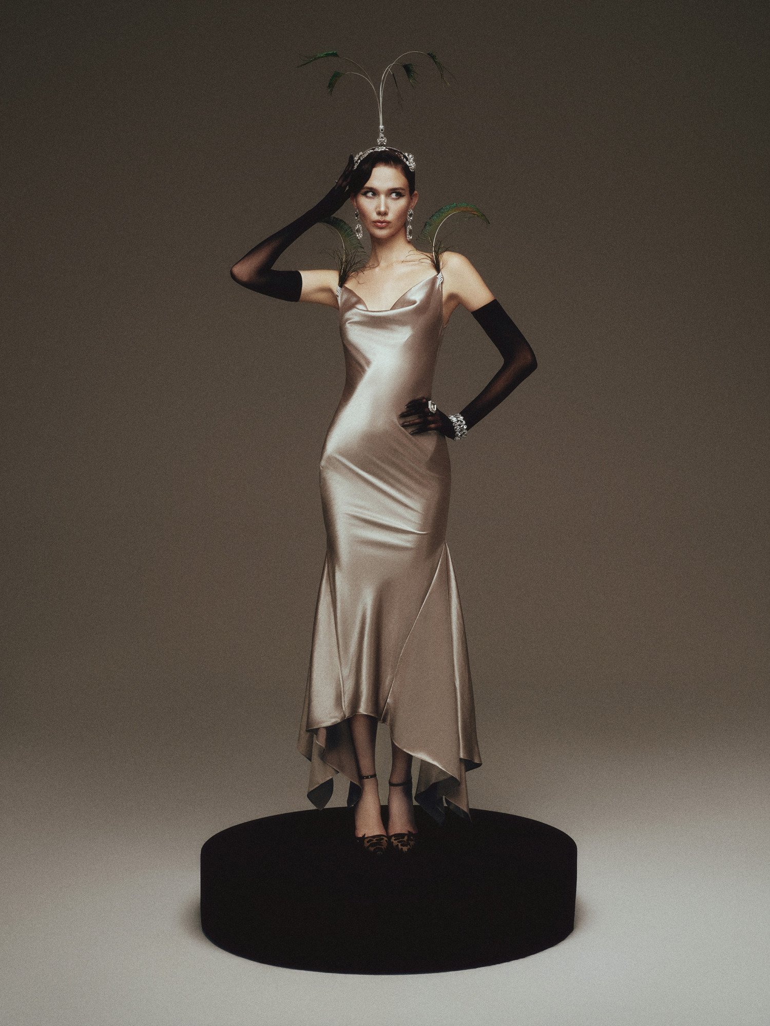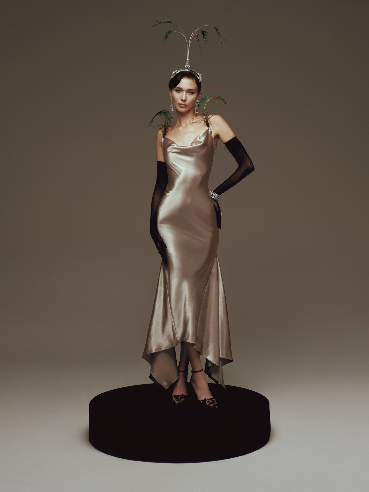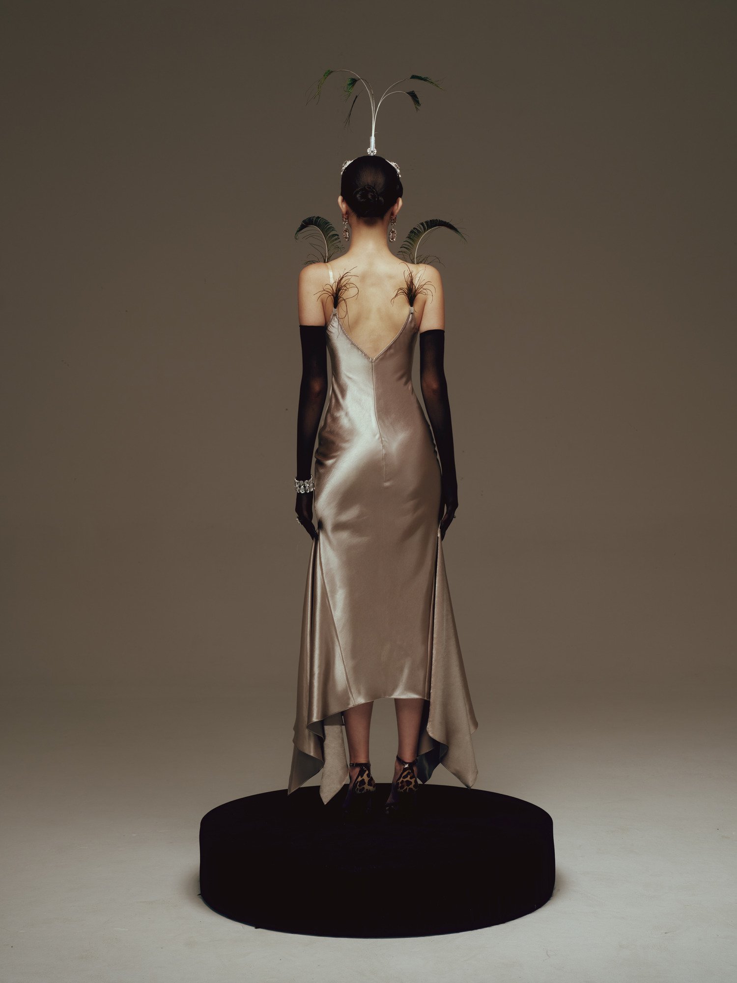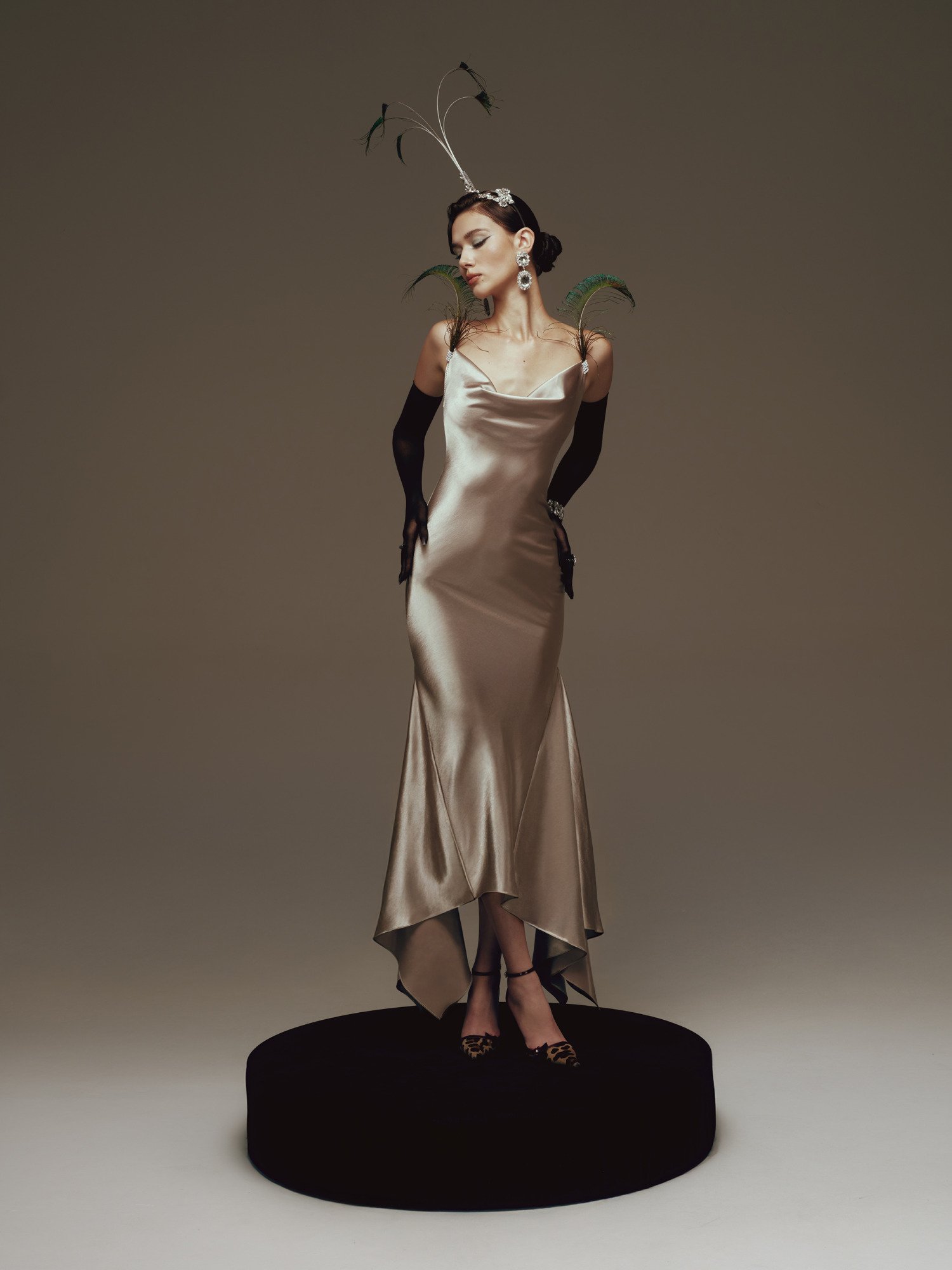 The design is crafted from premium satin, featuring a smooth, lustrous surface that gently catches the light while contouring the body to accentuate refined curves. The asymmetrical mermaid hem drapes fluidly with movement, creating a graceful, sensual effect that elongates the silhouette and evokes a sense of timeless, classic elegance.