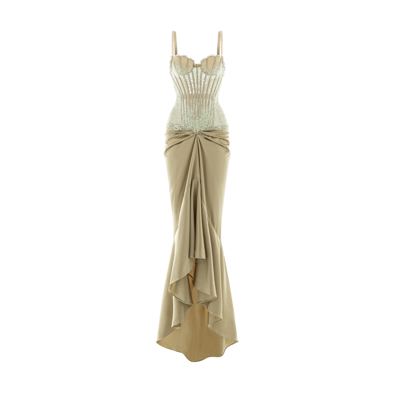 Valentina is like a quiet French love song humming in a golden afternoon—soft, yet utterly captivating. The embroidered lace corset embraces the body like a marble sculpture, elevating every curve with timeless elegance. The avocado silk skirt drapes in gentle folds, reminiscent of a vintage muse crossing an empty square, leaving behind a sweet, unforgettable trace.