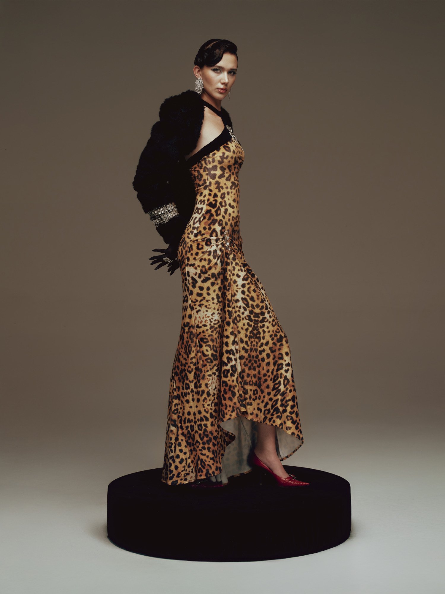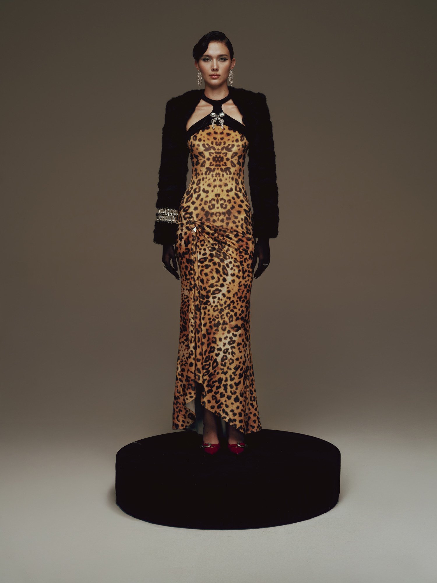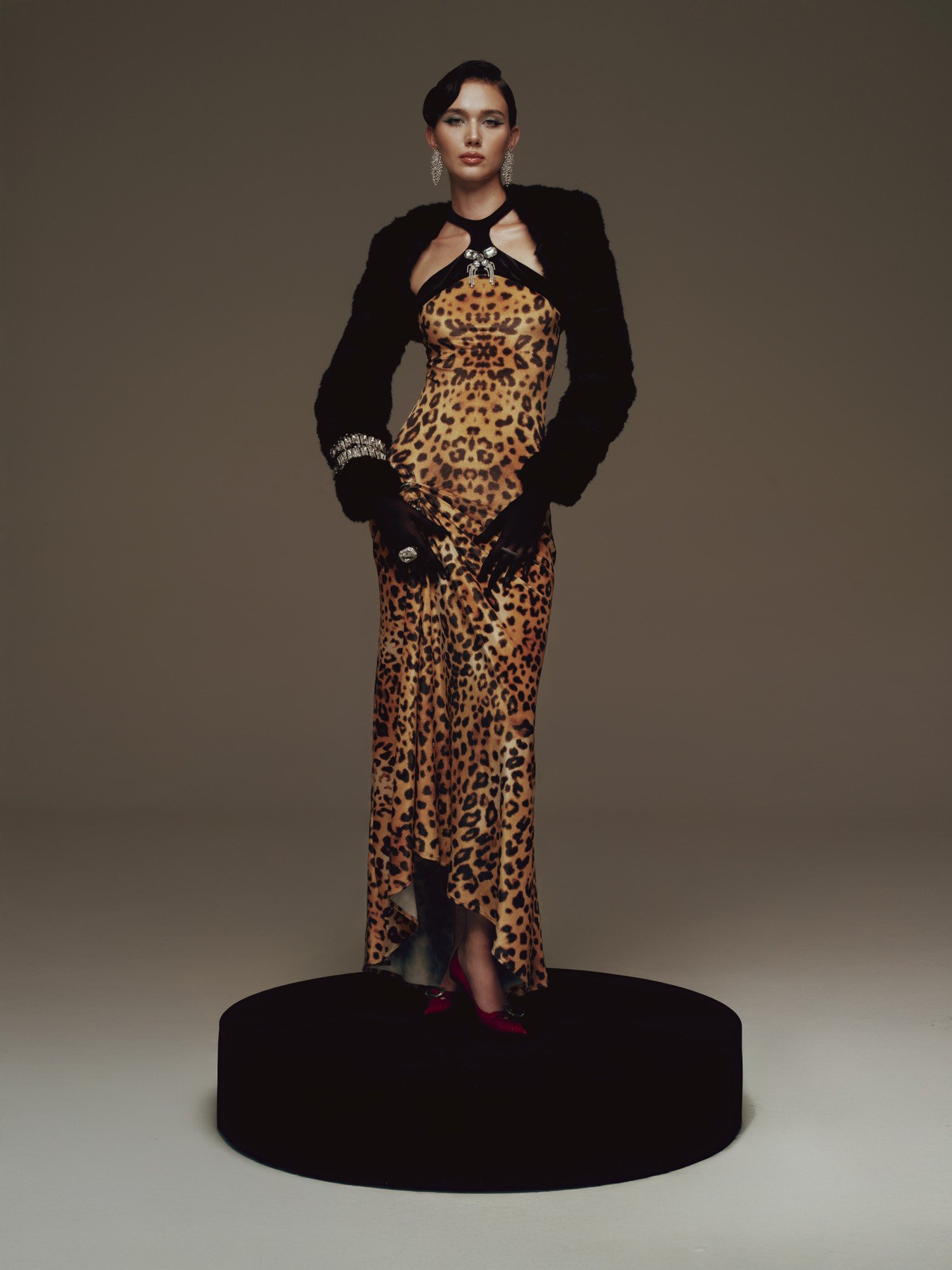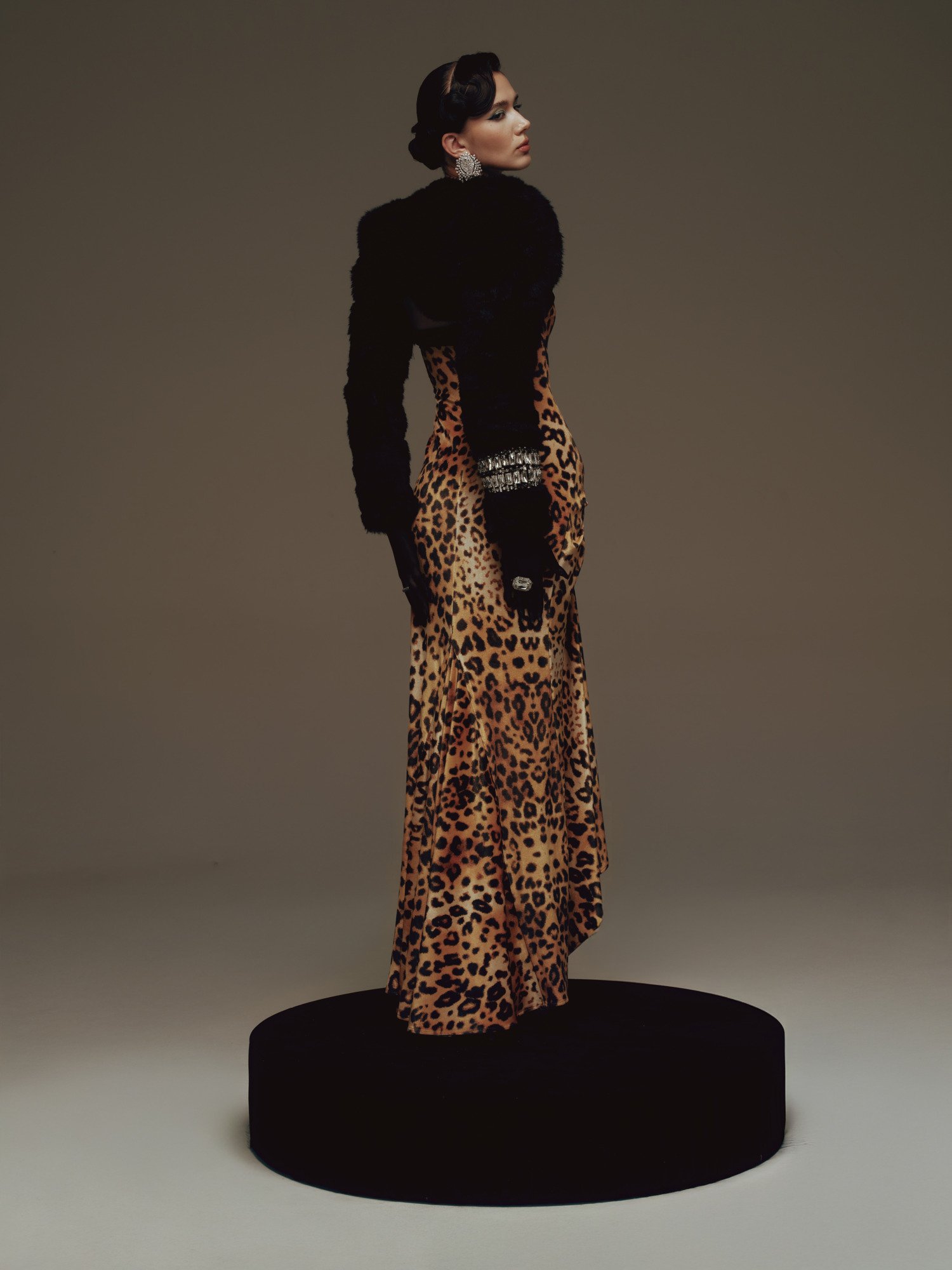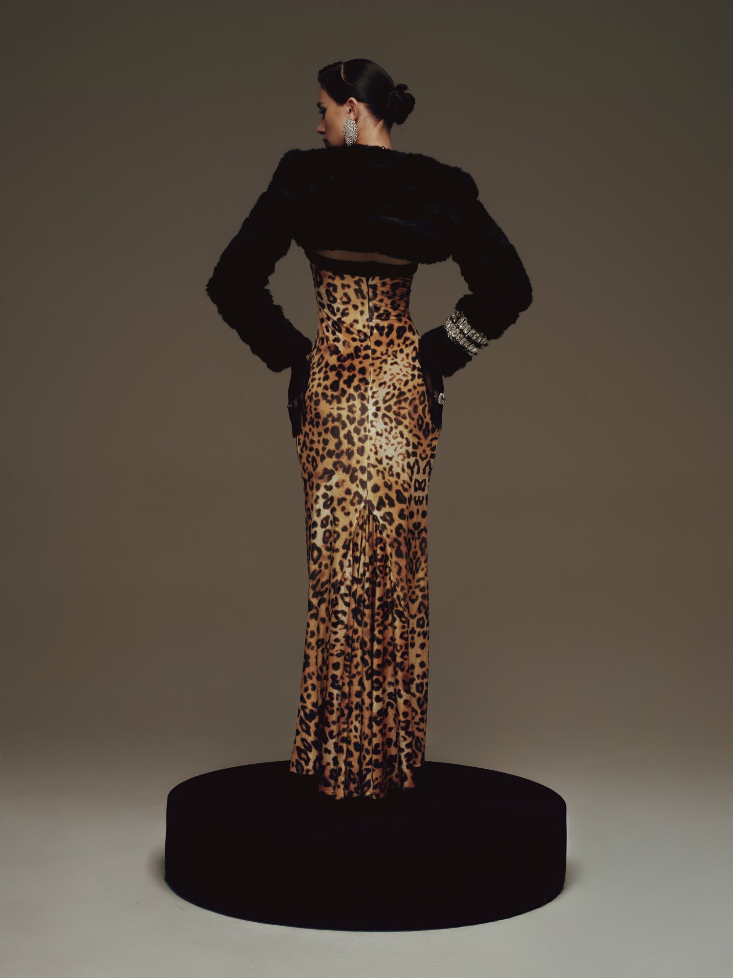 A cropped, fitted fur jacket cut at the waist, designed with bold, powerful shoulders that frame and enhance the neckline and décolletage. The soft black fur features short, dense fibers with controlled volume, maintaining a sharp silhouette without feeling heavy.