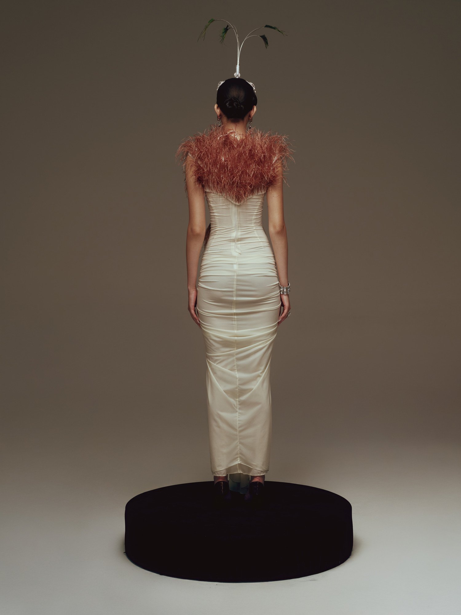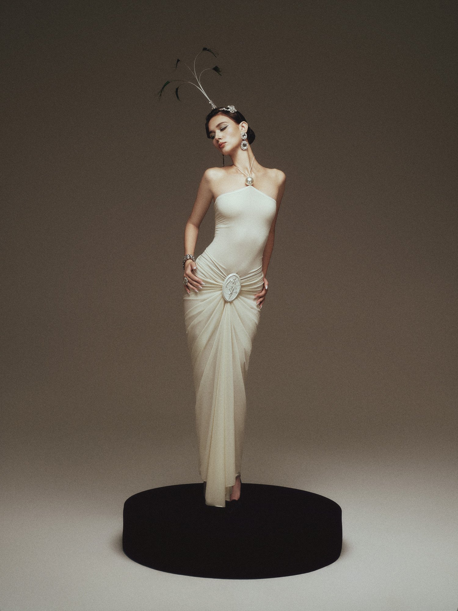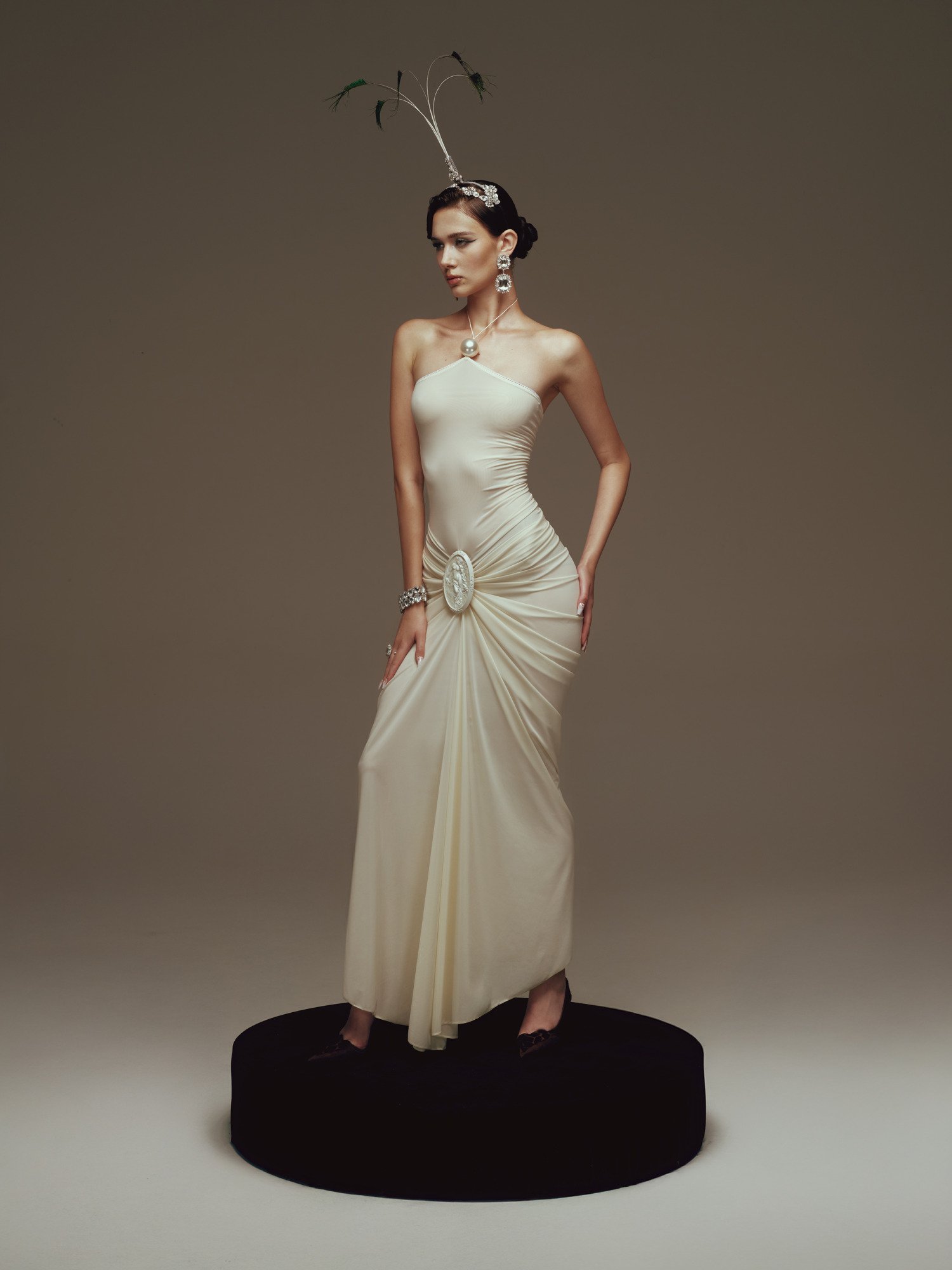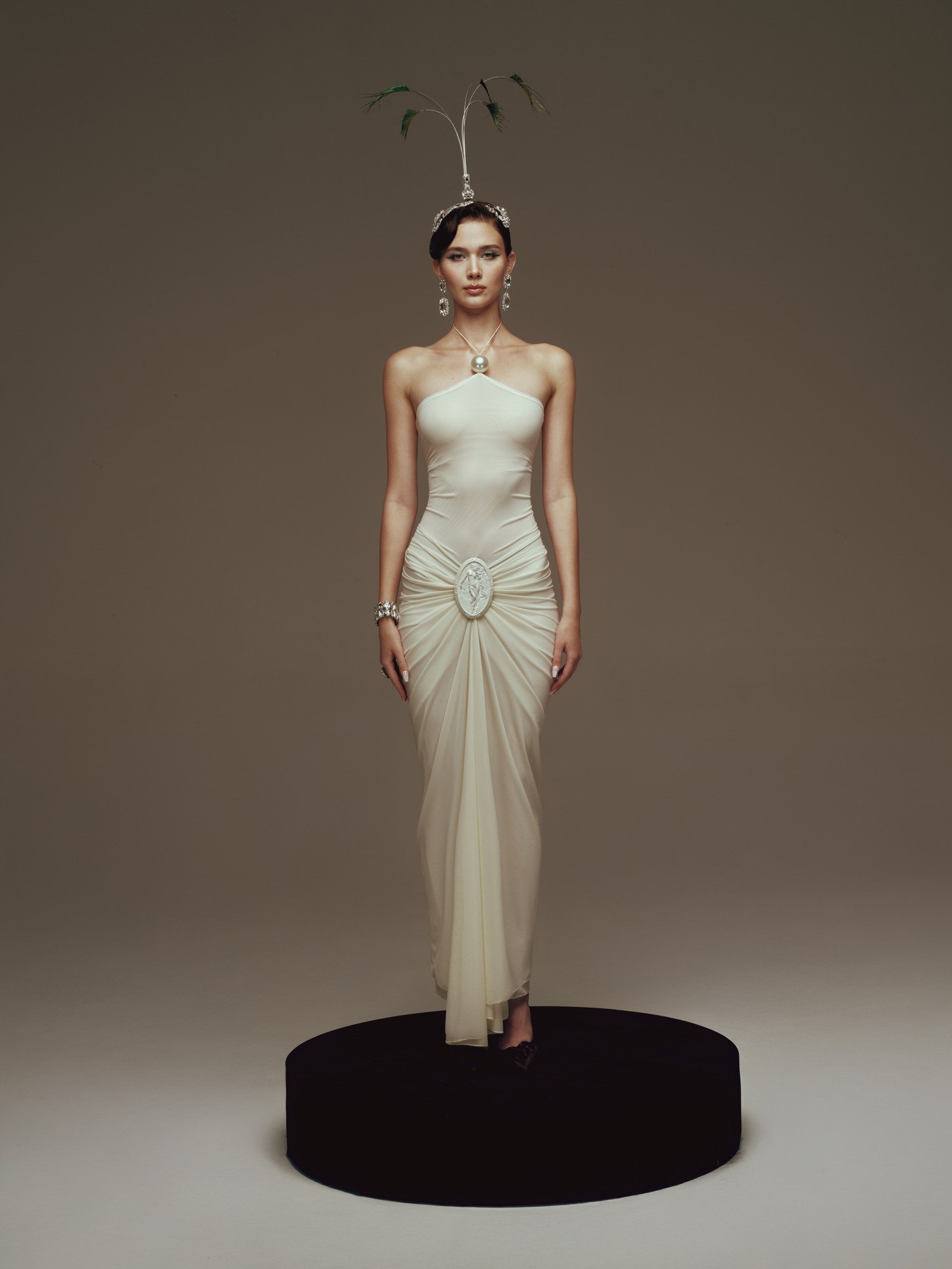 A softly contoured silhouette with delicate draping concentrated at the waist creates a flattering effect that elongates the figure. The focal point is a 3D-printed accessory shaped as the goddess Venus with a pearlescent finish, subtly placed at the center—both sculptural in presence and evocative of a sacred, classical goddess beauty.
